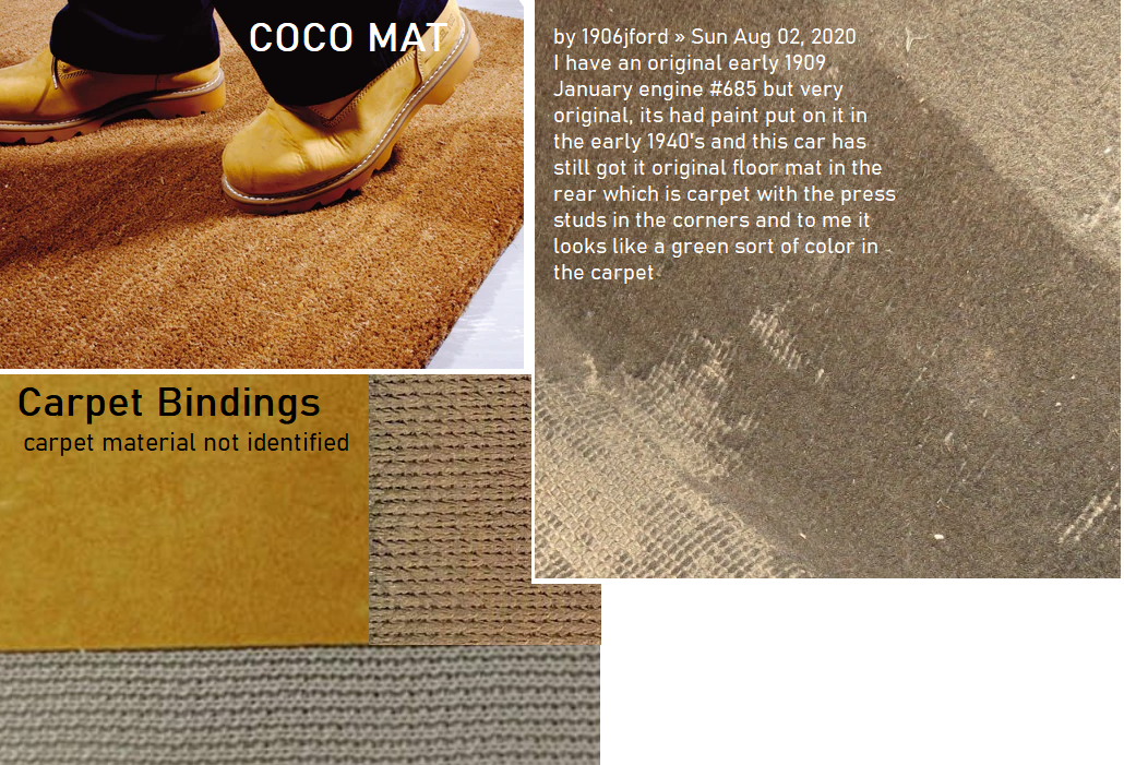 Just updated the chronology in my post above - cocoa mats from 1911 to mid 1917, wool felt to 1921 or 22, rubber afterwards, all for touring cars.