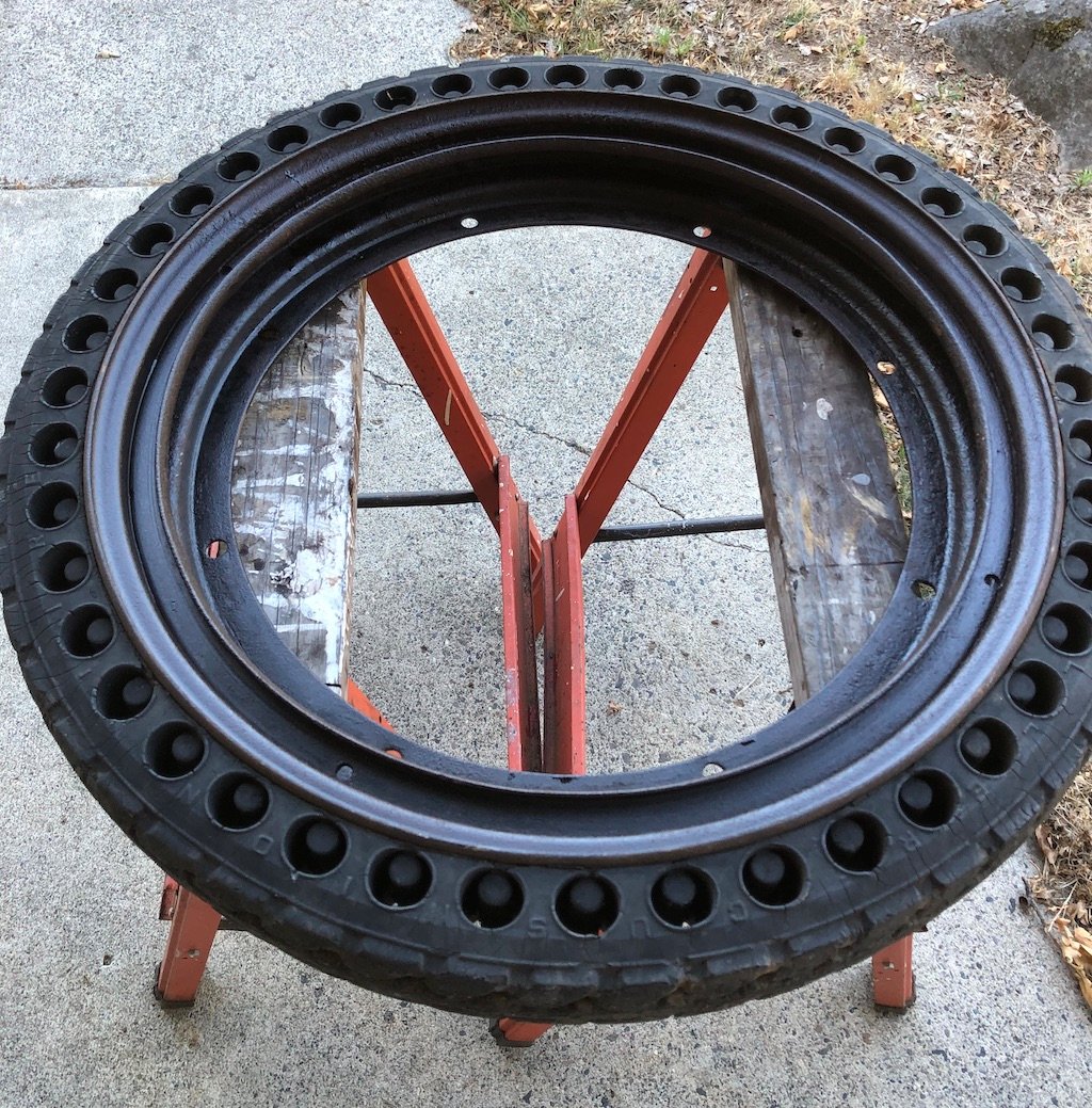 I've been cleaning one up to mount in my pickup bed as a "spare" (mostly cosmetic). At least I'll never have to pump it up! But I'm curious if any of you have experience driving on hard rubber rear tires-- especially hundred year old rubber. Is there a danger it will just disintegrate? Will it shake every bolt out of my car? Happy to run an experiment and report back, but thought I should check in first so I know what to expect and look for.