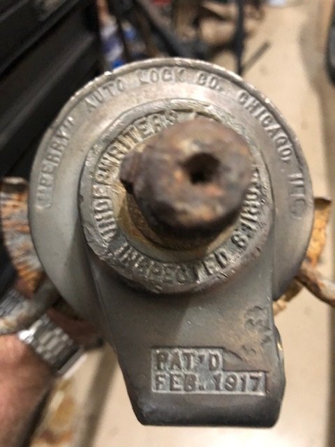 I buzzed the calcium off of the steering shaft lock so I could read what it says. It is a Perry auto lock company 1917 patent with a Yale brand lock. Underwriters laboratory tested. I did not know they existed in 1917. Discussed on MTF http://www.mtfca.com/discus/messages/25 ... 1333215460 Per the enclosed diagram, the mystery hole is a 'set screw'