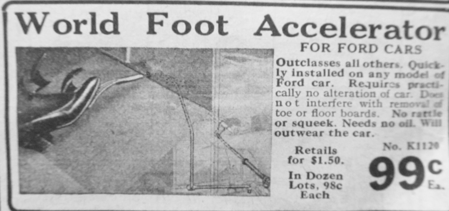 I tried the foot throttle on my 29 IH speedster flatbed once. It was dumb. It hangs on the wall. No control.