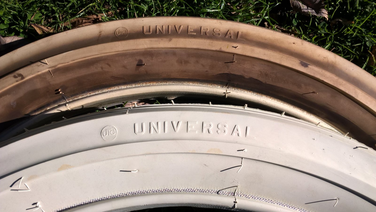 These new white tires seem to have a more porous surface finish when inflated as compared to the 30+ year old white Universals I have handled which seem to have more of a waxy finish.