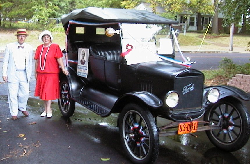 This is all bringing back some memories. Twenty years ago, Anja and I participated in the Greentree Parade here in Kirkwood. Since it was an election year, we decided to decorate the car appropriately. Since the car is a 1924 Touring, we opted for a Coolidge campaign car. (The sign on the side is a "Keep Cool With Coolidge" poster.) In addition to our dress and the car decorations, I also found a Coolidge campaign ad on microfilm in the Post-Dispatch archives. I photocopied it and made a bunch of copies. I drove in the parade and Anja handed out the "campaign flyers" to the people along the route.