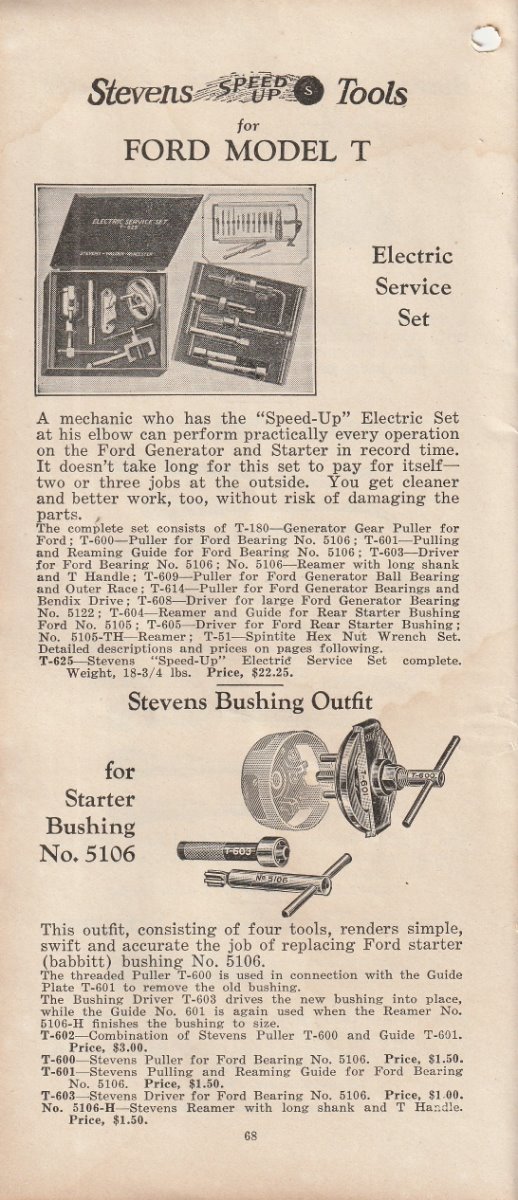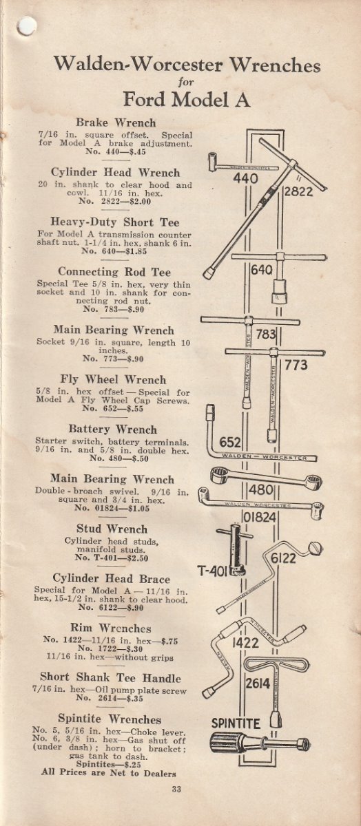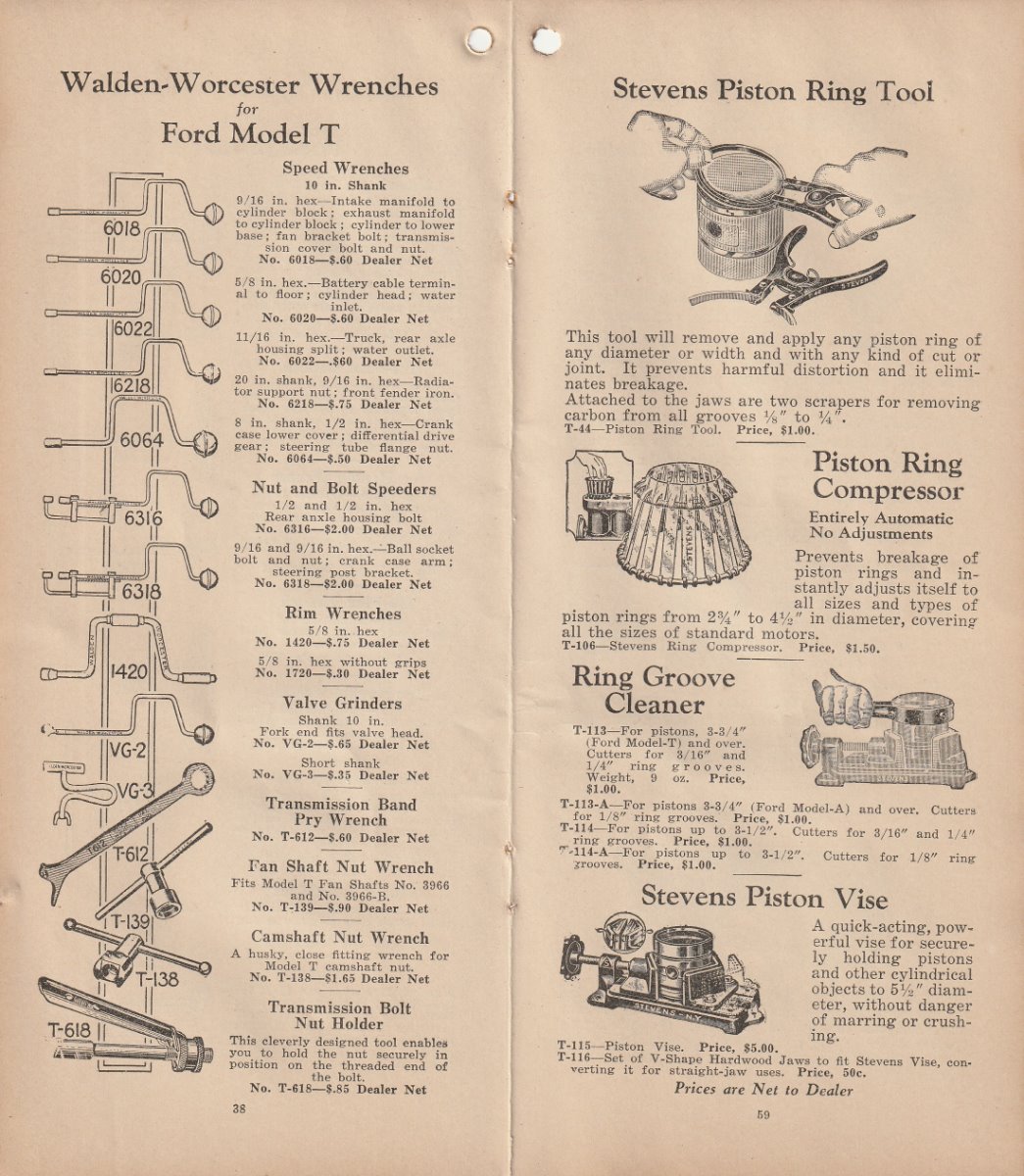 I finally acquired another Stevens catalog. They are very hard to find, and even harder to find one that is for sale. . It is what most folks consider the 1928 version. Stevens was bought out by Walden Worcester in late 1926. This is the catalog they put out after the buy out. It has most all the Stevens tools that were in the earlier catalog I re-printed several months ago,, and several tools that are in no other catalog that I know of. Most of them I have never seen in print before. I will post a few pic of some of the different tools. But I can not show all of them here. This catalog also has the Walden Worcester line of tools. Walden tools were not near the useable quality of the Stevens tools. Walden really stepped up their game when they acquired Stevens. Even though the Walden tools are not really as useful to us today, they are very collectable. This catalog will show what each Walden tool number is used for. There is also a small section of tools for the new Model A that just came out. There are a few pages of tools for Dodge, Chevy, Buick ect. It appears that Walden/Stevens was trying to widen their market in 1928. There is not much of the "other makes" tools. Most of the catalog will apply to our Model Ts. A lot of the Walden tools were considered to be useable on most all cars and trucks, so they are shown as "standard" tools even though they are some of the the same tools shown in the Model T section. This catalog is a very good reference for taking to a swap meet. The catalog is about 4 by 8-1/2 inch and has 96 pages not counting the covers.
