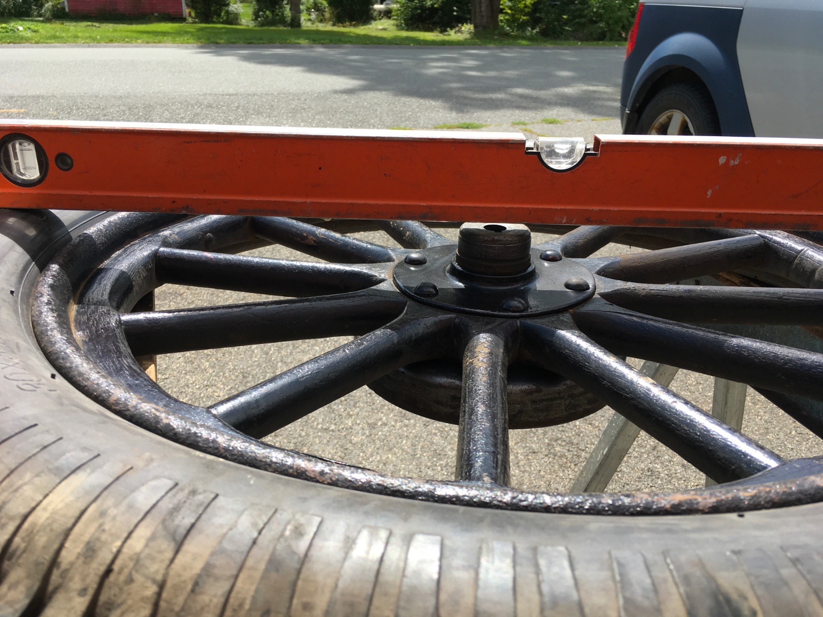 I have posted in the past how to true-up a wood felloe wheel via the Dyke's manual method based on my own experience.