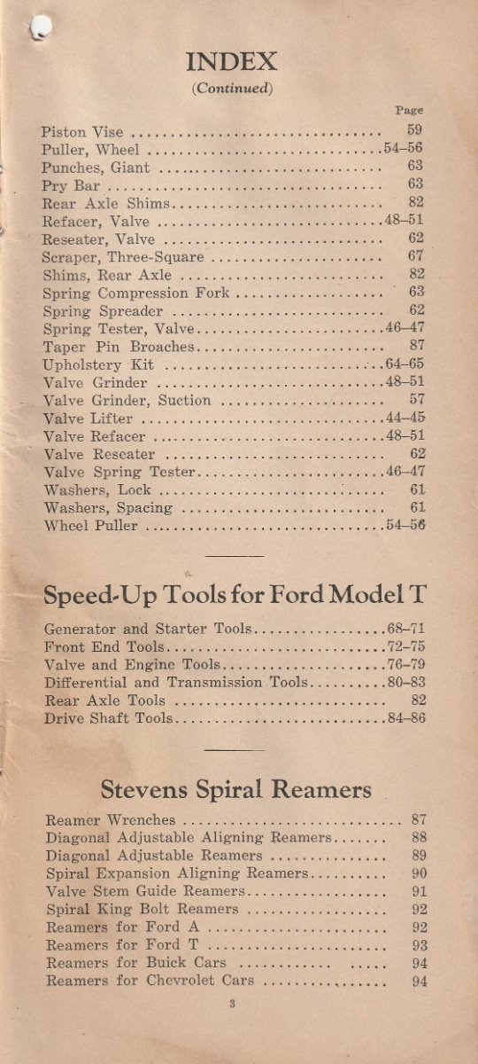 I finally acquired another Stevens catalog. They are very hard to find, and even harder to find one that is for sale. . It is what most folks consider the 1928 version. Stevens was bought out by Walden Worcester in late 1926. This is the catalog they put out after the buy out. It has most all the Stevens tools that were in the earlier catalog I re-printed several months ago,, and several tools that are in no other catalog that I know of. Most of them I have never seen in print before. I will post a few pic of some of the different tools. But I can not show all of them here. This catalog also has the Walden Worcester line of tools. Walden tools were not near the useable quality of the Stevens tools. Walden really stepped up their game when they acquired Stevens. Even though the Walden tools are not really as useful to us today, they are very collectable. This catalog will show what each Walden tool number is used for. There is also a small section of tools for the new Model A that just came out. There are a few pages of tools for Dodge, Chevy, Buick ect. It appears that Walden/Stevens was trying to widen their market in 1928. There is not much of the "other makes" tools. Most of the catalog will apply to our Model Ts. A lot of the Walden tools were considered to be useable on most all cars and trucks, so they are shown as "standard" tools even though they are some of the the same tools shown in the Model T section. This catalog is a very good reference for taking to a swap meet. The catalog is about 4 by 8-1/2 inch and has 96 pages not counting the covers.