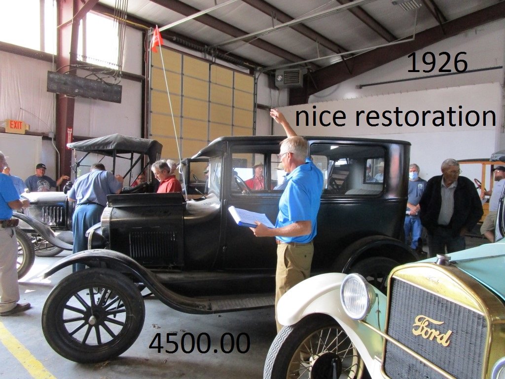 Dan, I was in process of posting the results, so Ill just post them here. The best two cars there were my old 1921 touring and the 1915 touring. My 1921 was a solid driver when I sold it to Ken. It would hand crank on mag with one finger and free started 90% of the time. Other than a repaint and uphoulstery it was a original wood, original parts unmolested car. The 1915 touring was also a good deal, It also was a good correct car. All parts were correct 1915 except the hogs head. When Ken bought it from a estate, he brought it to me to fix. The hogs head was gone and it appeared to have been in the process of a band change when the previous owner died. ?? I did not have a correct hogs head and Ken did not care anyway so we put a cast iron non starter hogs head on it. It was a nice drive when I got it running for him .. I drove it about a week before he came and got it. I think it was the best deal of the day. Even though I knew the cars from years ago, none of the cars has ran in over 10 years (or more). The rest of the Ts were a mix of older restorations that were fair condition or were "Yard Art" that had "lipstick put on a pig" For example the TT truck was a rough old "yard art" piece that he bought from me. It was very rusty, locked up incomplete engine, ect. Ken had some one paint it (over the rust) install plexi glass windows, put some pine boards in the bed, and made a couple plywood floorboards. That was it "Lipstick on a pig" About 1/2 of the Ts were "lipstick on a pig" type of cars. It seems like most of the buyers did not really notice the difference in a good car or a ???? I show pics of a 1949, 1950, and 1951 Ford cars. They were the most expensive cars there. I show the pics because the auctioneer did not even clean them up and also ruined the tires by loading and moving them on flats. I did not buy a thing but there were some good deals on the 40s 50s 60s 70s era cars and trucks.