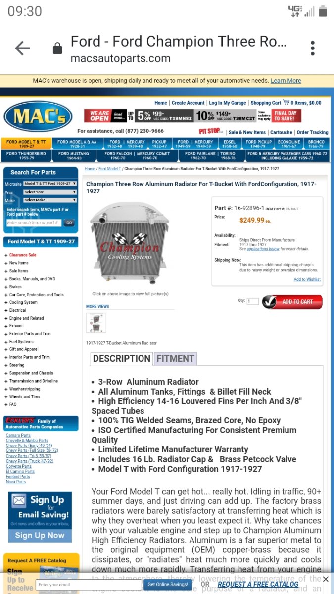 John, you are exactly correct. I first wondered why the stock rad shell wouldn't fit. As it turns out, these are meant for obviously T-bucket guys, but are designed so no shell is needed, and you can just paint it black, or the upper tank and side panels to match whatever color the body is. I've since seen these on T-buckets with a Ford emblem stuck to the upper tank.John kuehn wrote: ↑Tue Sep 22, 2020 7:58 pmGood post Chad on the modifications that need to be done for the aluminum radiator to fit.
