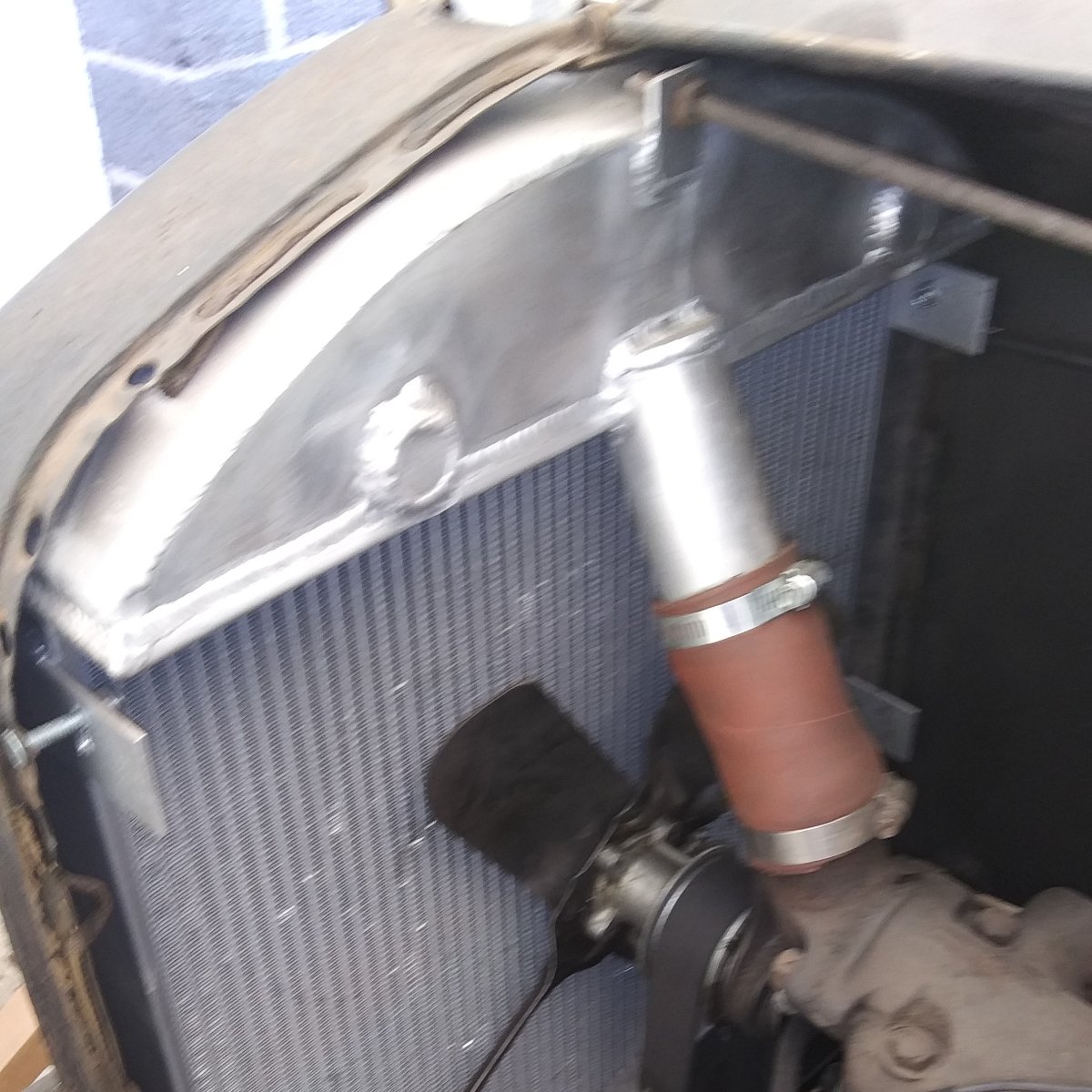 I purchased one off eBay that is setup for late model Ford (I believe). The radiator outlet is in the correct location. I fabricated an "S" to line up the engine outlet with the radiator inlet. The fittings on the radiator is smaller in diameter than the "T"