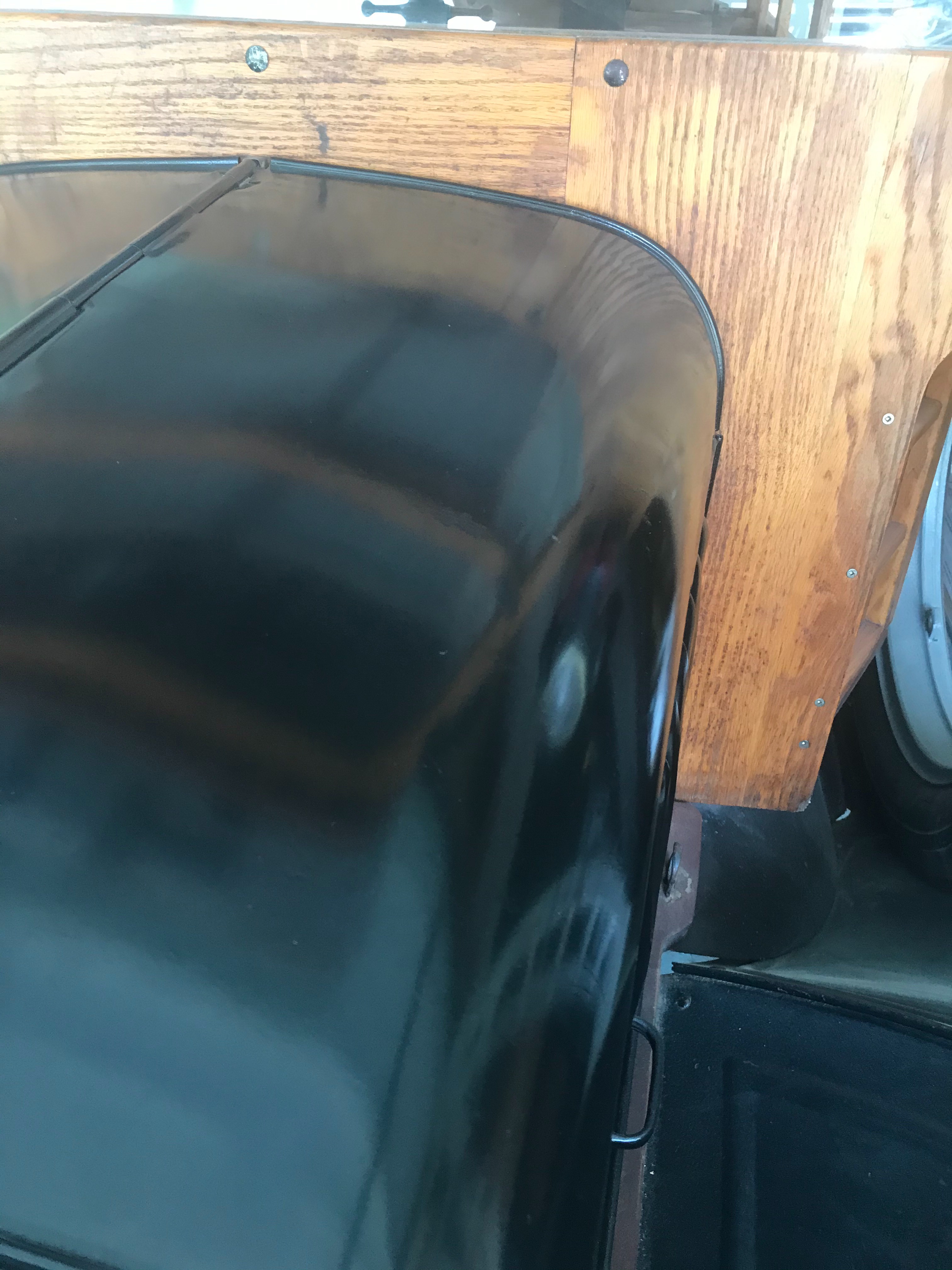 Hi Bruce. This is how I did the fender, but this technique can be used for other parts as well, such as the hood, doors, trunk and body. When I first bought my ‘26 coupe In 1970, the entire car, including this fender was originally covered with thick rust, dents and tears. The body behind the doors were shot through with several big 45 cal. bullet holes. When I restored it, I took off the rust with muriatic acid down to the bare metal, brazed the tears and bullet holes, beat out the dents With body working block and tools and smoothed the dents and rust pits with bondo. Then using a spray gun, sprayed both sides of fender with red oxide primer and finished with gloss black lacquer, wet sanding between coats. After 40 years, in 2011, it was ready for re-painting. I made repairs and wet sanded smooth with 400 grit paper. In some places, I sanded through the lacquer to the primer and occassionally through to the bondo. I applied the Rustoleum Appliance epoxy directly onto this surface as well as the underside of the fender. When Applying this paint, you need to heed the advice of Wyatt Earp when, late in life he was asked “what does it take to win a gunfight?“, to which he replied “you take your time in a hurry”. This applies perfectly to painting. Before painting, prepare a dust free area, preferably indoors, where you can paint and where it can dry. Blow off all surfaces close to the painting area and sweep and blow Dust from the floor, out of the room. Let it settle and do it again. If you have a big pedestal fan, point it away from the work to the outside to carry overspray away from the work and out of the room. Also, prepare a narrow waist high table for the fender that will enable you easy access to walk around the fender and spray from all angles. Have a good 3” fine bristle paintbrush In your back pocket to use to whisk off the dust prior to painting. Just prior to painting, use your air compressor outside to blow all the dust from the top of your head , your clothes, pants, down to your shoes and while you are painting, try to hold your breath when painting. Turn your head away from the work when exhaling. If you see a bit of dust or a bug settle on your perfect finish, do not try to remove it. You can spot correct it by softly wet sanding with 600 grit sandpaper and compounding. If you get no dust specks, bugs or flaws, this coat should be the only coat you need to apply, but it may take two weeks to fully dry, because, using this method, you are basically applying 2 coats at the same time, which is necessary for the smooth, wet, mirror like surface. Be careful not to apply it too thick that it causes it to run.