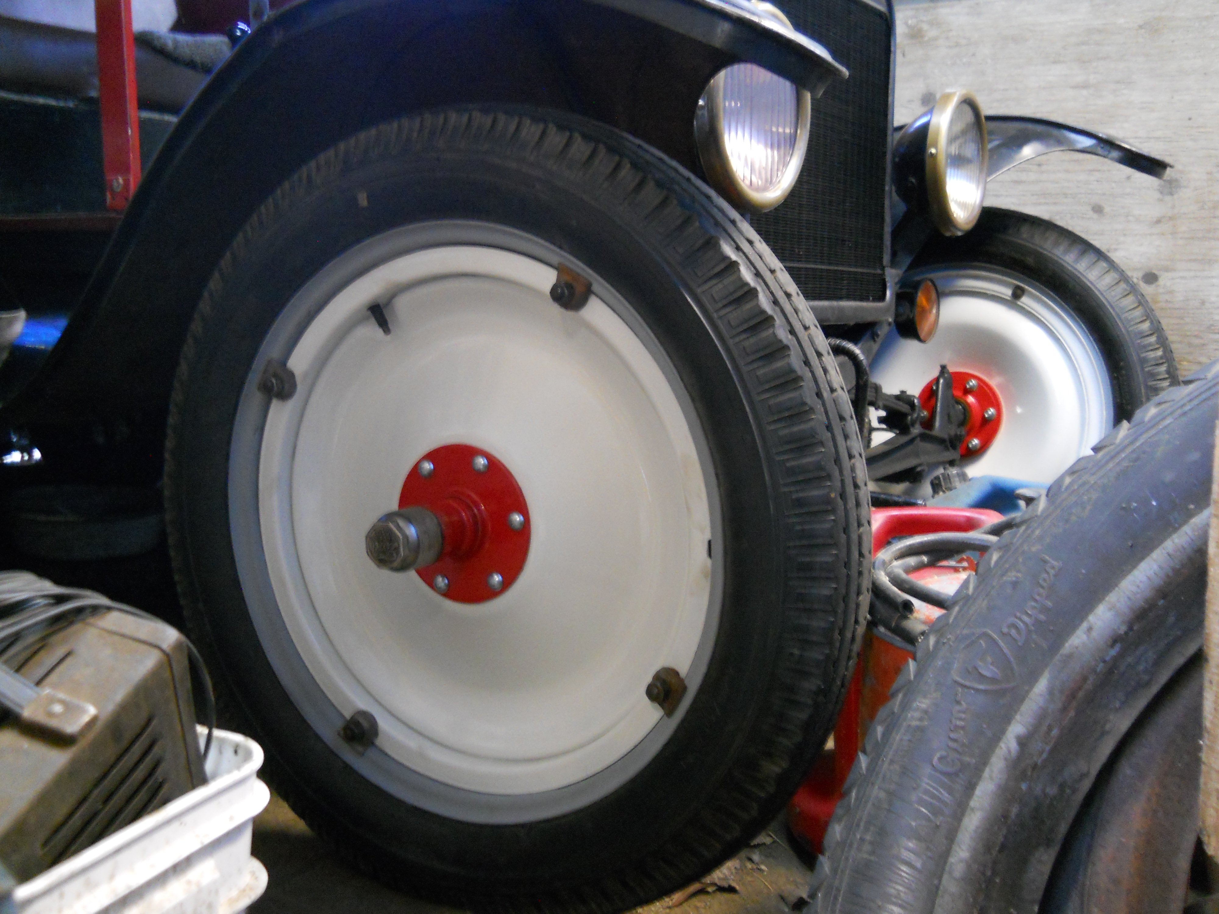 You will need to drill holes to match the Ford wood wheel hub and use the flange plate. I mounted mine with 1" thick 6061 aluminum spacers between the hub and wheel. I think 1925 was the first year for the disk wheels, but they are not the ones you want to use, not a lot of them anyway. The 1926/27 or 1928 would be the best bet. What ever year you use, make sure the rims are correct to the years. In 1928 the rims got wider as well as the felloe on the wheel. The wheels are somewhat easy to find, the rims not so much. it took me a while to find a set of the Jaxon lugs, bolts and correct rims. The inside dimeter of the hole that goes over the hub is larger so when I made my spacers I added a lip for the wheel to sit on when installed. When I bored the hole to install the on the hub, I picked an average for press fit, some being a bit tighter then others.