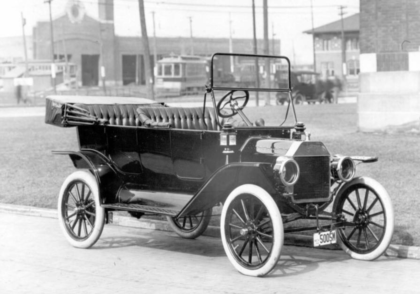 I think this photo was taken in Highland Park at the corner of Woodward and Manchester. This would have been at the southwest corner of Ford’s Highland Park plant. Part of the foundation of the “Administrative Building” is visible to the right.