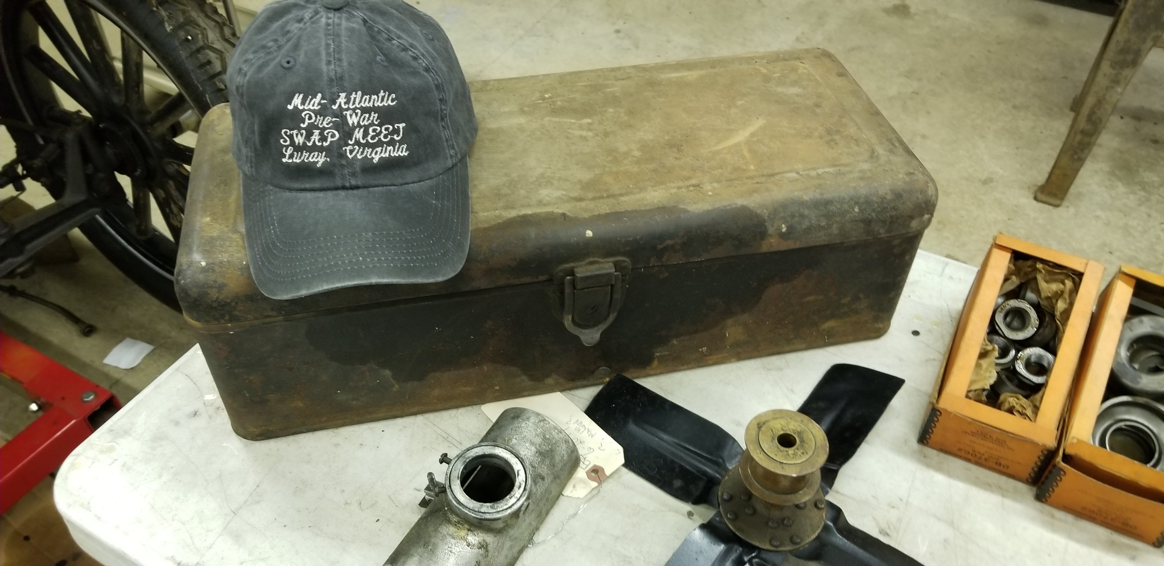 Luray was awesome... report on your finds so everyone can see. I did well. I found a good brass hub fan with a good crown, three boxes of n.o.s. ball type wheel bearing parts, along with a box of used ones to sort through, compliments of Mike Silbert. Bob Richmon is a nice guy and brought me a Model T tool box along with a rarely seen Maxwell belly pan. Tom Strickling sold me some Splitdorf Model H magneto parts, and after I made 35 trips past his booth, he gave me a great deal on a Maxwell carburetor- the likes of which I've never seen before. I also managed to find a 1908/09 straight script Maxwell hubcap. Bill price sold me some old school oil filters for my big block Chevelle, and I rounded out the day by purchasing another Luray hat to my collection. If you didnt make it to Luray, you missed a great one-time FALL event to take the sting out having no Hershey. If you did make it, let's see your treasures!