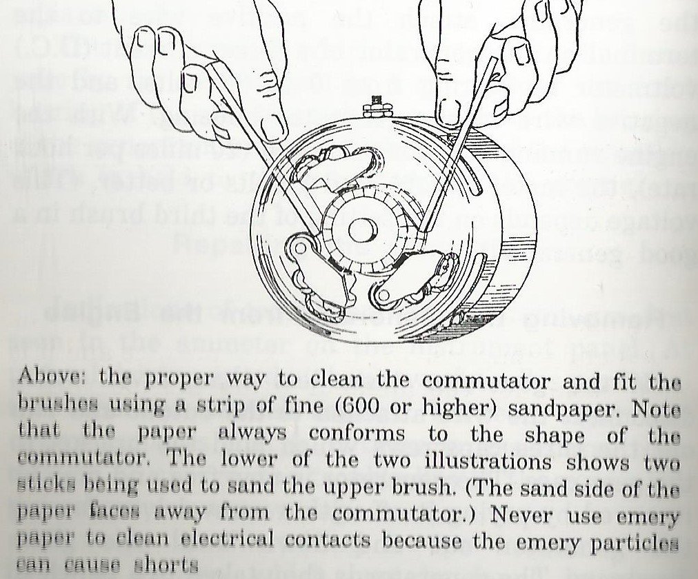 I then locked the brush plate in the neutral position (12vt+ to the output terminal, —ve to the case, 3rd brush lifted) where it would not motor in either direction (actually it really only motored in one direction and barely tried to motor at the other end of brush plate travel). After dropping the 3rd brush onto the armature, the generator motored nicely on 6-volts and drew about 4-5 amps. Again: so far, so good.
