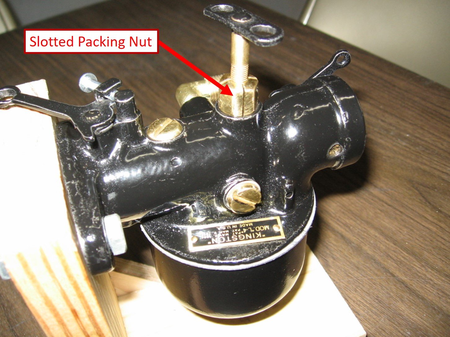 If you want to inspect the needle, loosen the packing nut all the way and unscrew the needle from the carburetor. If the tapered end has a groove worn in it from being tightened too tight, you can dress away the groove like this: