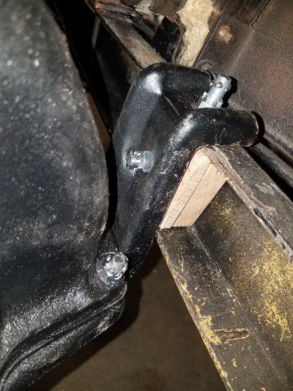 Unless you have a late 25-27 TT truck the stock frames and all stock pan ears have a hole. Use a thin box end wrench and some tape to hold the nut and pre mark the bolt to locate split pin hole up and down. Use long nose pliers to place split pin and bend just enought to hold pin. The picture doesn't show it but the wood block has a champer edge that goes down and to the frame side. This is for the fuel line on the carb side.