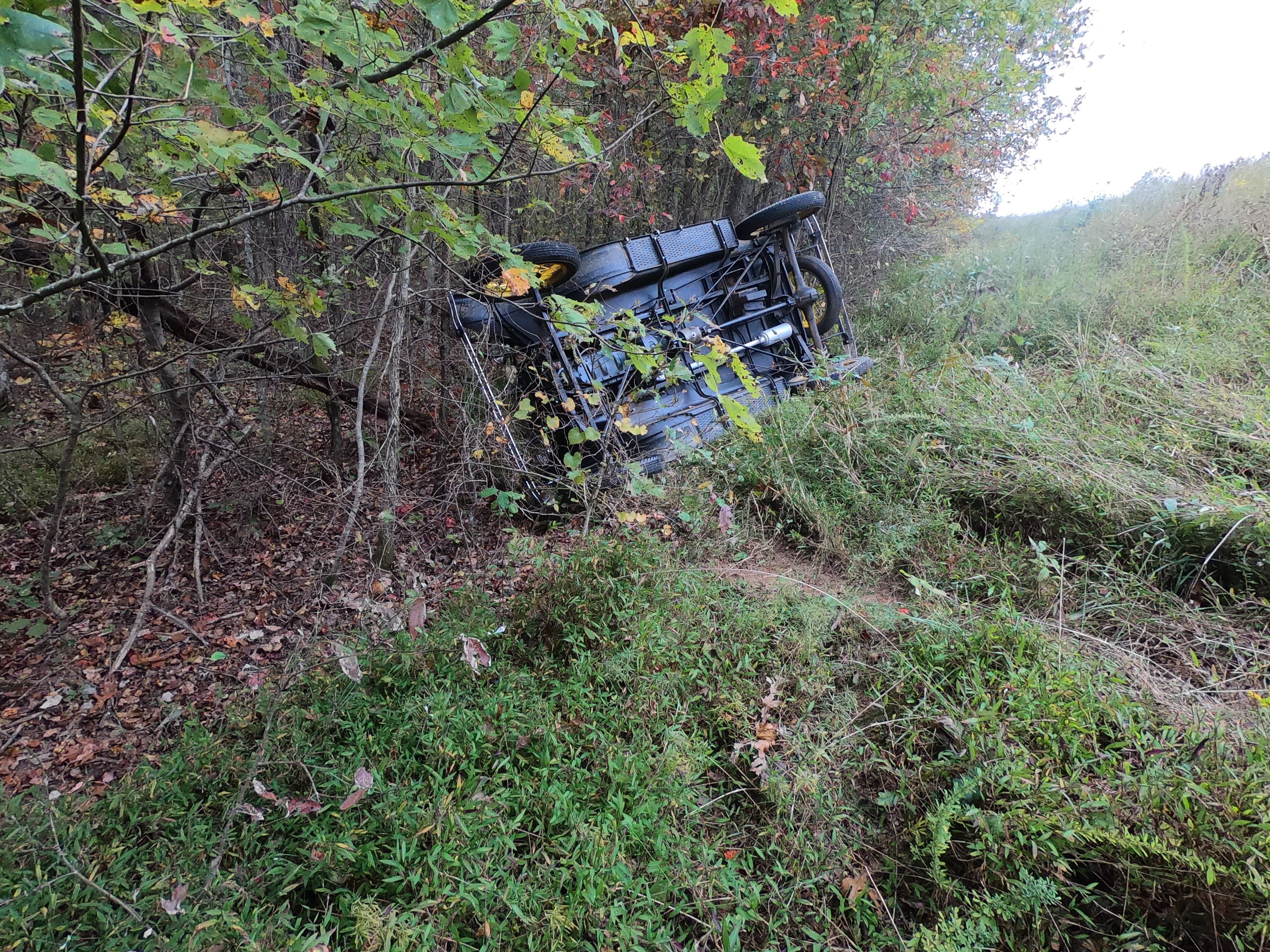 Let me say this first. My wife and I are not hurt. My wife is sore from the crash but seems OK. This week while on tour, I messed up. While climbing a hill in Warford 3 (overdrive) I let my speed get too low and missed a shift into Warford 2. The Rockies did not hold in reverse (I knew that they do not work in reverse) But because I was also in Warford neutral the Ford brake does not work either. I could not get the Warford (new KC Warford) back in gear, maybe because I had already started to roll back ???. But in the few seconds of trying to get it back in gear and also I saw another T behind me and turning to miss it. I lost my window of time to pull the hand brake. In aprox 5 to 7 seconds from the missed shift I was already headed down a steep embankment in a hard turn. then sliding sideways down the embankment and flipping over at the bottom. The person behind me said the whole event happened in seconds. Im not saying Im the best T driver in the world, but I have years of experience behind the wheel of a T. So even an experienced driver can screw up. We were very lucky the T landed in the trees or it would have flipped all the way over. So everyone please stay aware of what can happen when out driving....