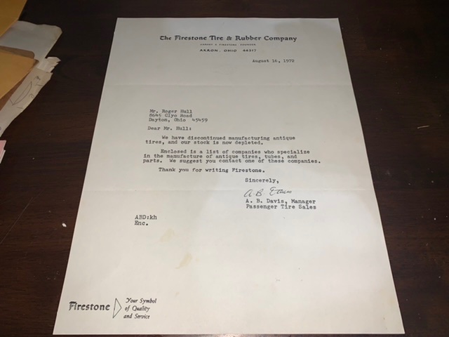 Last night, I found letter, dated 8/16/1972, from Firestone to my grandpa about getting out of the antique tire business.