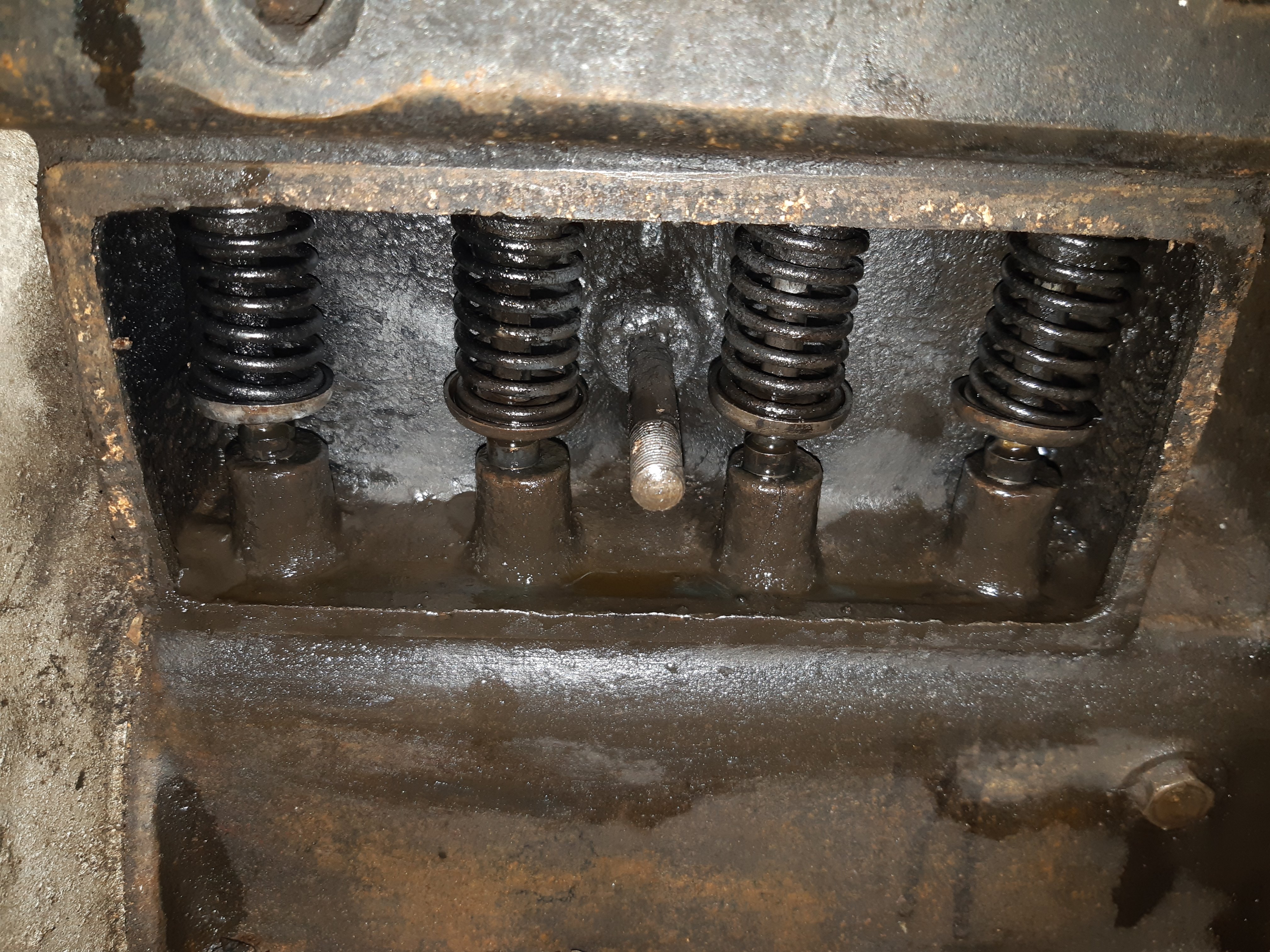 This engine had sat for 30 plus years and had almost no oil in the pan and was overall dry. Yet when I took off a valve cover out ran a couple ounces of black oily goo. There was oil trapped in the valve chambers.