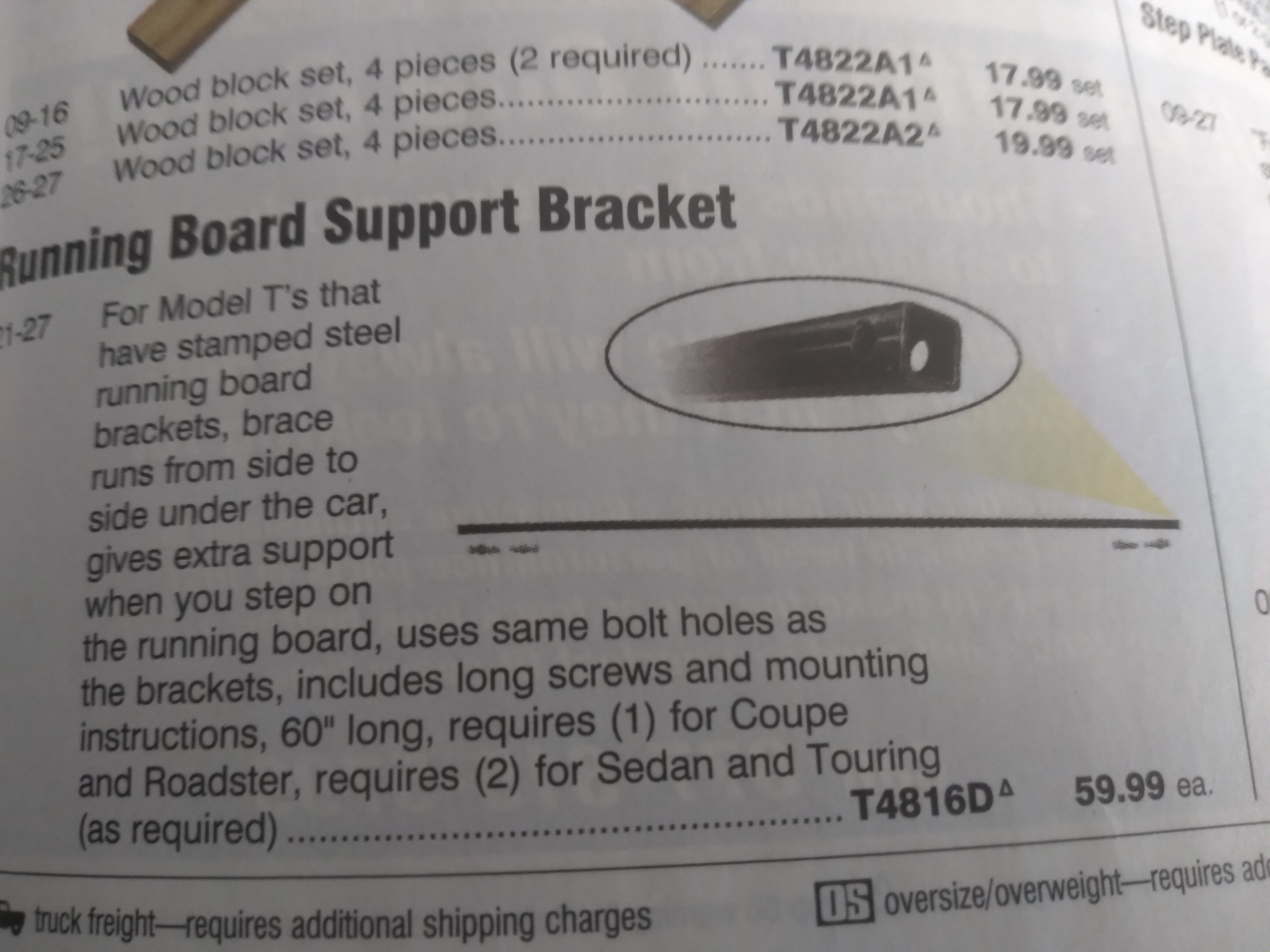 After market. They fit up tight under the running board from adjustable brackets that hang from the chassis and do help to keep the running boards from sagging, especially under the weight of heavy passengers. There was a pair of them on my all original 1926 T coupe when I bought it, but were so rusted, I did not use them. I wish now that I had kept, restored and used them, just to have the original after-market accessory, for, even how, at 230 lbs., I am a little paranoid to step on my running boards to access the car for fear of causing them to sag, but at 6’-3” I am fortunate enough to be able to enter the car without having to step on the running board. Jim Patrick.