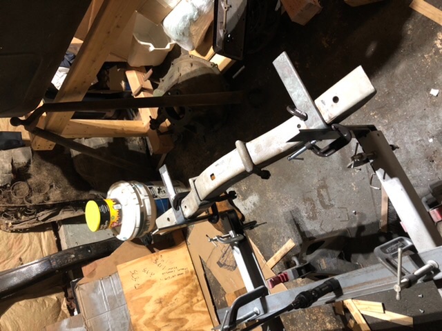 Got the old rusted in place front leaf spring out after cutting the tie bolt and wedging the leaves apart and out. New leaf spring ready after I install the new perch bushings. Thanks to "T" springs in W Hartford for the nice quality front and rear springs.
