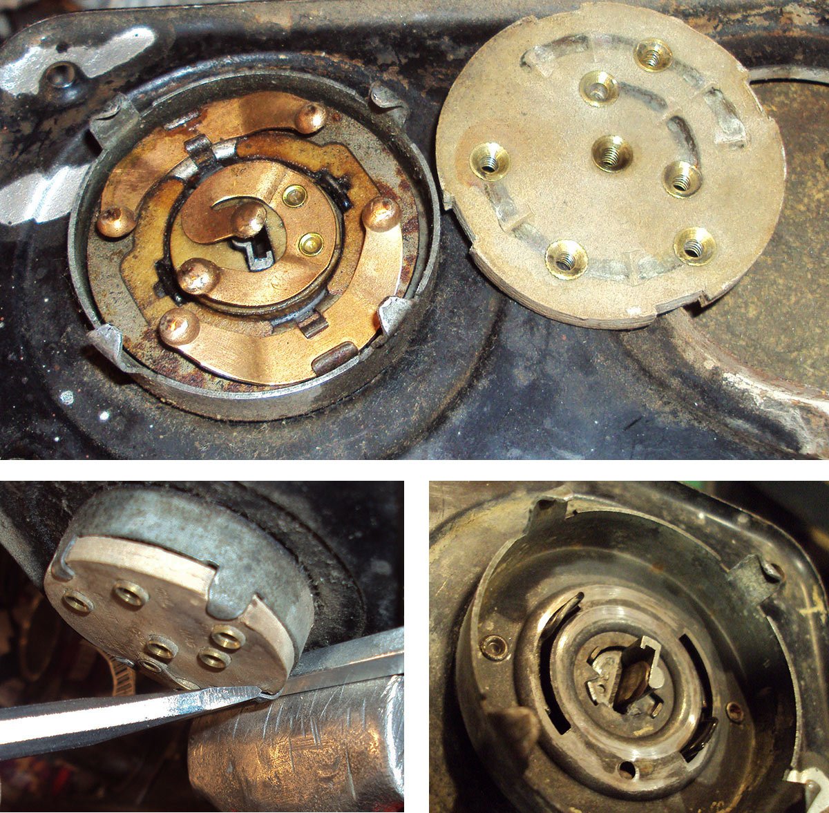 This switch back plate has an extra contact. Circled in red it appears it would connect with the coil contact when the ignition switch is in the off position. I am baffled as to what that would accomplish. Also, (highlighted) above the mag contact reads SIDE. This was a 3-pin plate with the early "bend over" tabs on the switch handle. I'm guessing late '20 or so. Also interesting was a nickel plated stand-off spool on the coil contact (center).