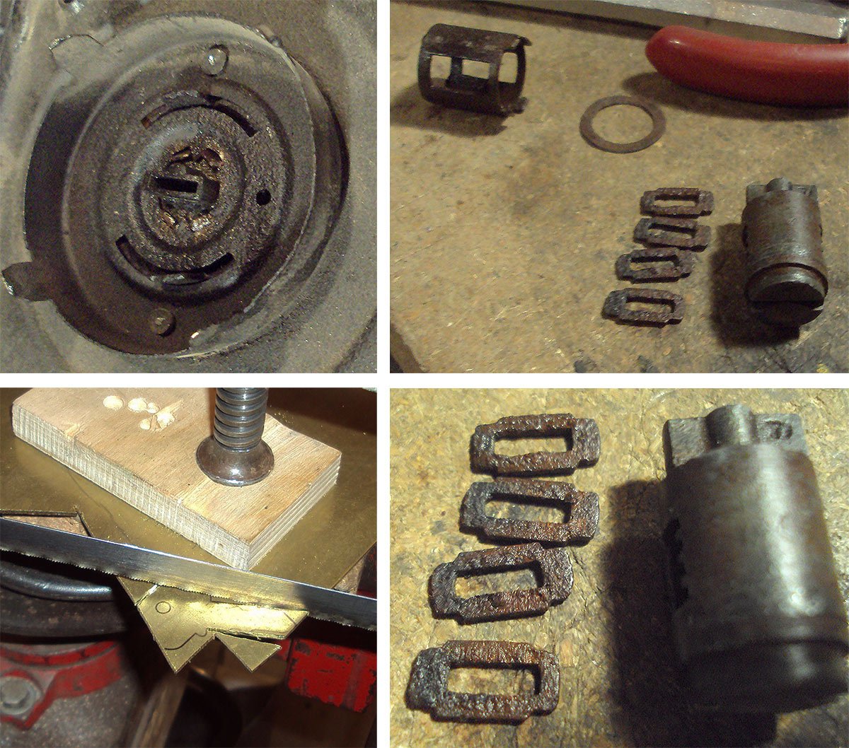 The next effort was to try and get another switch to work. This one had a good cylinder although the tumbler plates were rusty. I took them apart keeping track of which went where and cleaned them as best I could. I ordered keys for this one and some others but not wanting to wait I tried to make a key. That did not work and I didn’t want to tweak the plates to make it work.