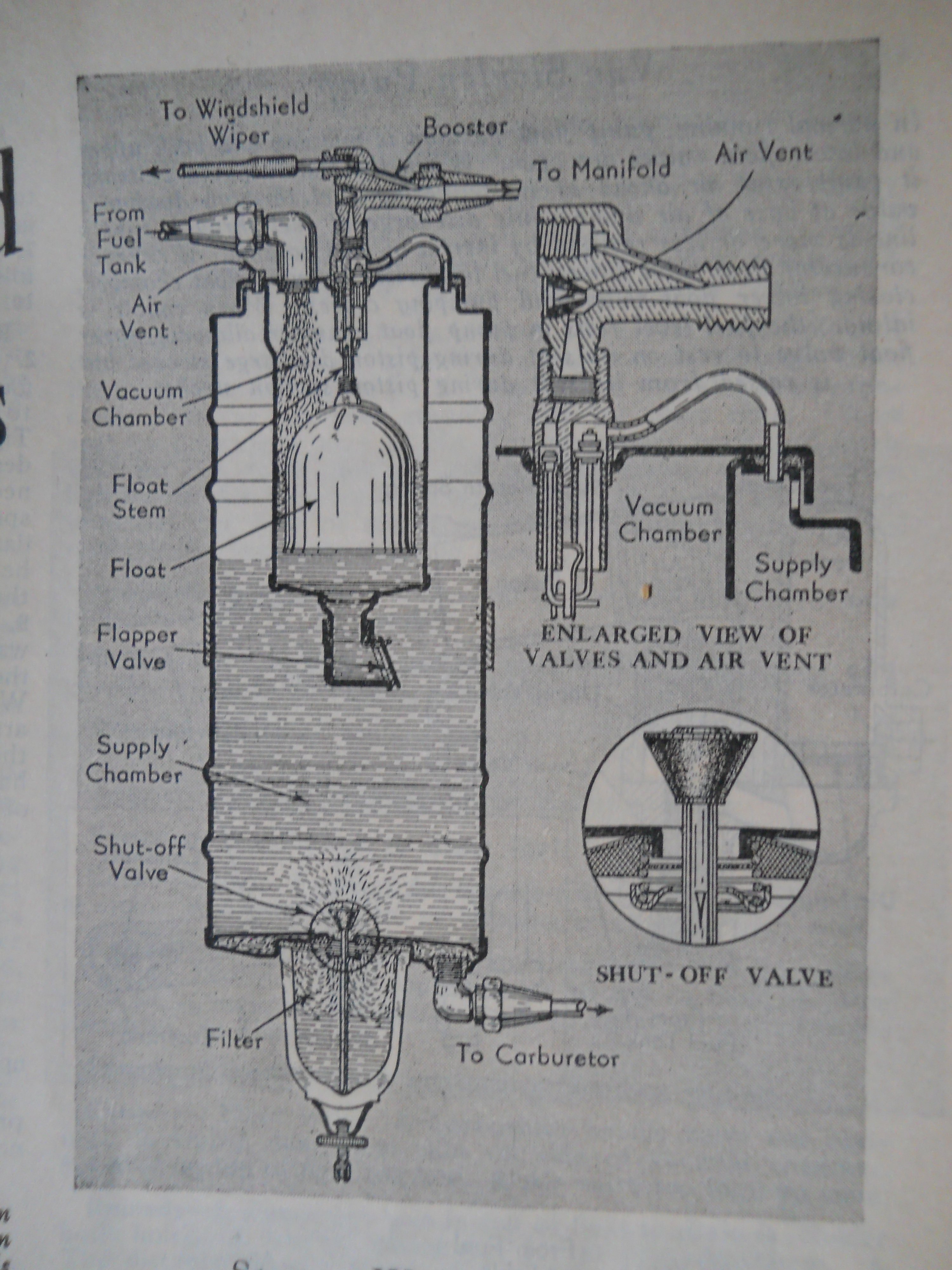 When float is down, float stem holds valve to intake manifold open and air valve to supply chamber closed so that suction from intake manifold reduces pressure in vacuum chamber and closes flapper valve thus drawing fuel from the rear supply tank. When vacuum chamber fills, the float rises and the float stem closes valve to intake manifold and opens air valve to supply chamber, giving atmospheric pressure to vacuum chamber. Fuel then flows through flapper valve until float again sinks. When carburetor float valve is closed, vacuum tank float remains up and no fuel is drawn into the tank. Shut-off valve at bottom of tank closes when the filter bowl is removed.
