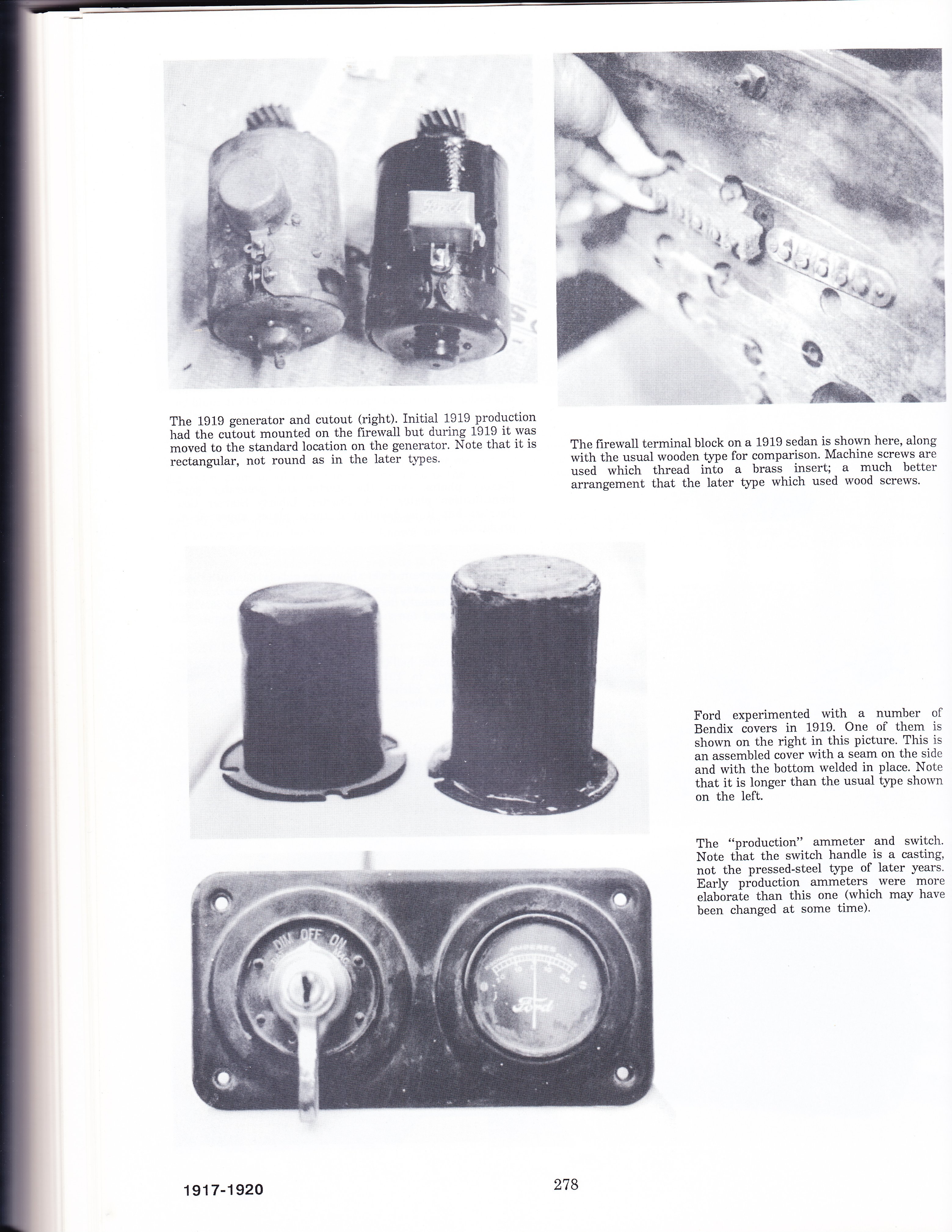 I have the early F.A. starter and generator with the early/different style cover for the brush end of the starters and generator, shown on page 277 of Model T Ford by Bruce McCalley (changed to the more common T-5101 cover band later). I also have the square cutout but I still need to find an early ignition switch with the cast handle and then I should have everything correct for the early lighting/electrical system.