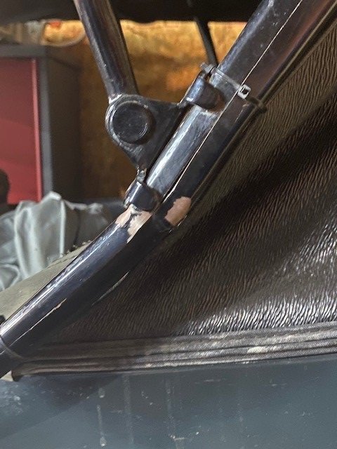 Noticed the main bow for the top on my '27 touring is bent at the joint following the final tour of the year. The car had sat for several years before I took position last year. So the joints are very stiff and difficult to move