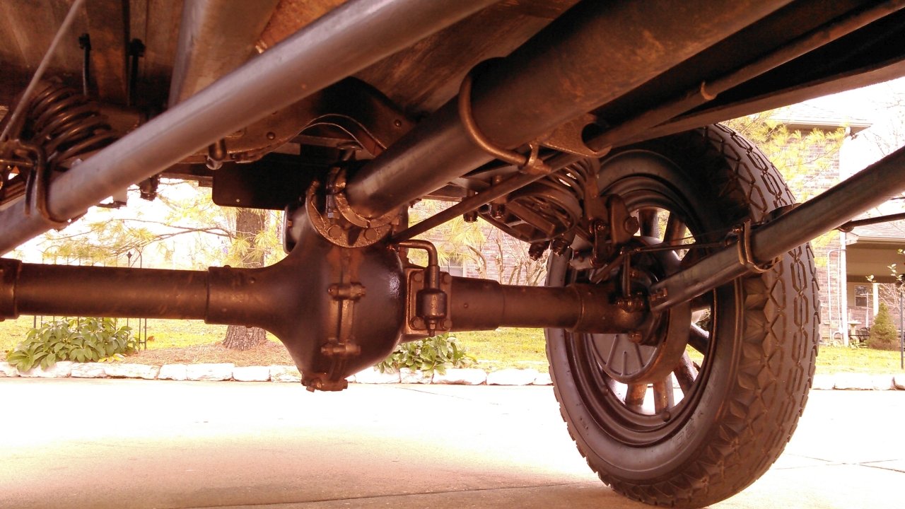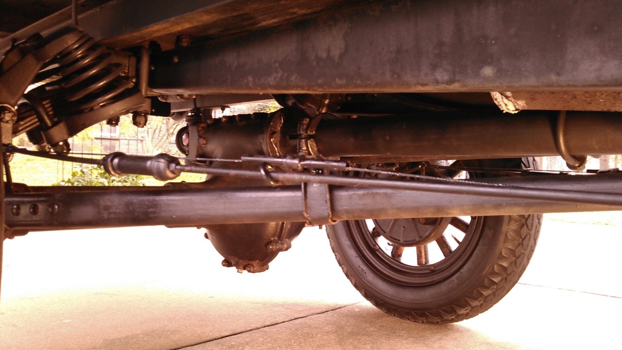 The black Iron pipe is my design to make the brake rod collapsible when I apply the rear brakes. I put a brake equalizer and stainless-steel cables attached to the rear brake cam levers on the truck so I could use the rear parking/emergency brakes as service brakes. Since the rear brakes have linings, I can use them as service brakes. That way I can increase my braking power by 3 times. I also had to do this since I added a Muncie gear box that increased my speed and it also has a true neutral to the drive train. When I push the foot brake pedal, the rear brakes are applied as well as the transmission brake. The truck stops much quicker. I also wanted to keep my brake rods in their original position, and have a backup braking connection.