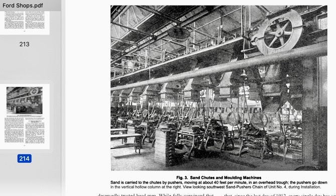 "Ford Methods and the Ford Shops" is a really EXCELLENT book. It is comparable in standing the the Nevins history of the Ford Motor Co. They deal in the most extreme detail on nearly every Ford Model T manufacturing process, for nearly every major assembly. It took them nearly a year to get ALL the assembly lines up and running. One of the best stories is about the front axle assembly line, which Ford though was doing an A-1 job, but after they made the line a moving assembly line, the differences were incredible. He also gives the actual production costs of many of the parts, both before and after the moving assembly line conversions, such as $2.63 for each engine pan they made. Also shows the layouts of the various sub-assembly points in the factory, and has pictures of a lot of the operations that go into them.