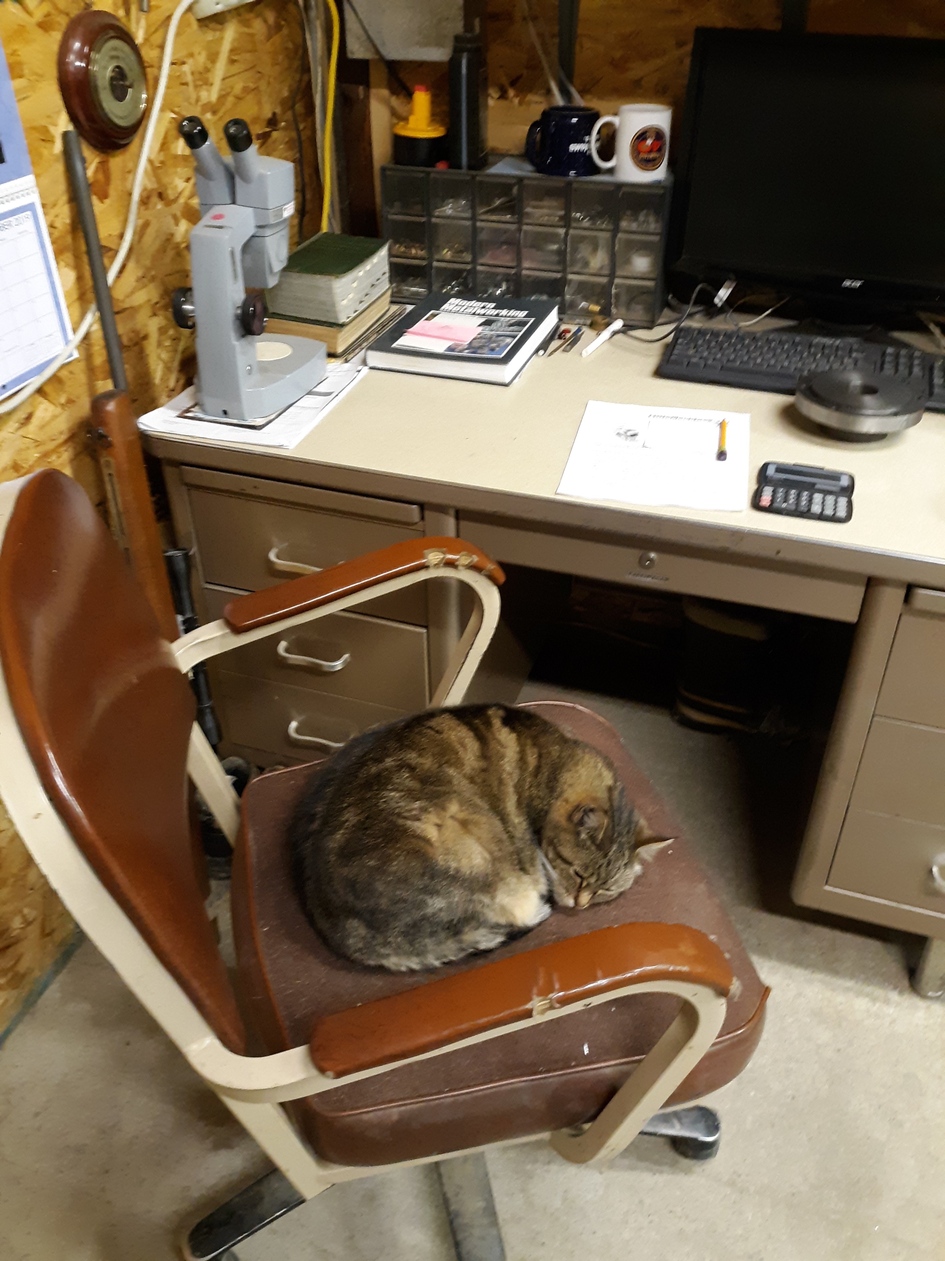 My old shop cat winters in my shop office, in the same spot and same position. When it warms up she will venture out into the shop and be a total pest. Between the old shop cat and the three barn cats I have no rodents in anything.