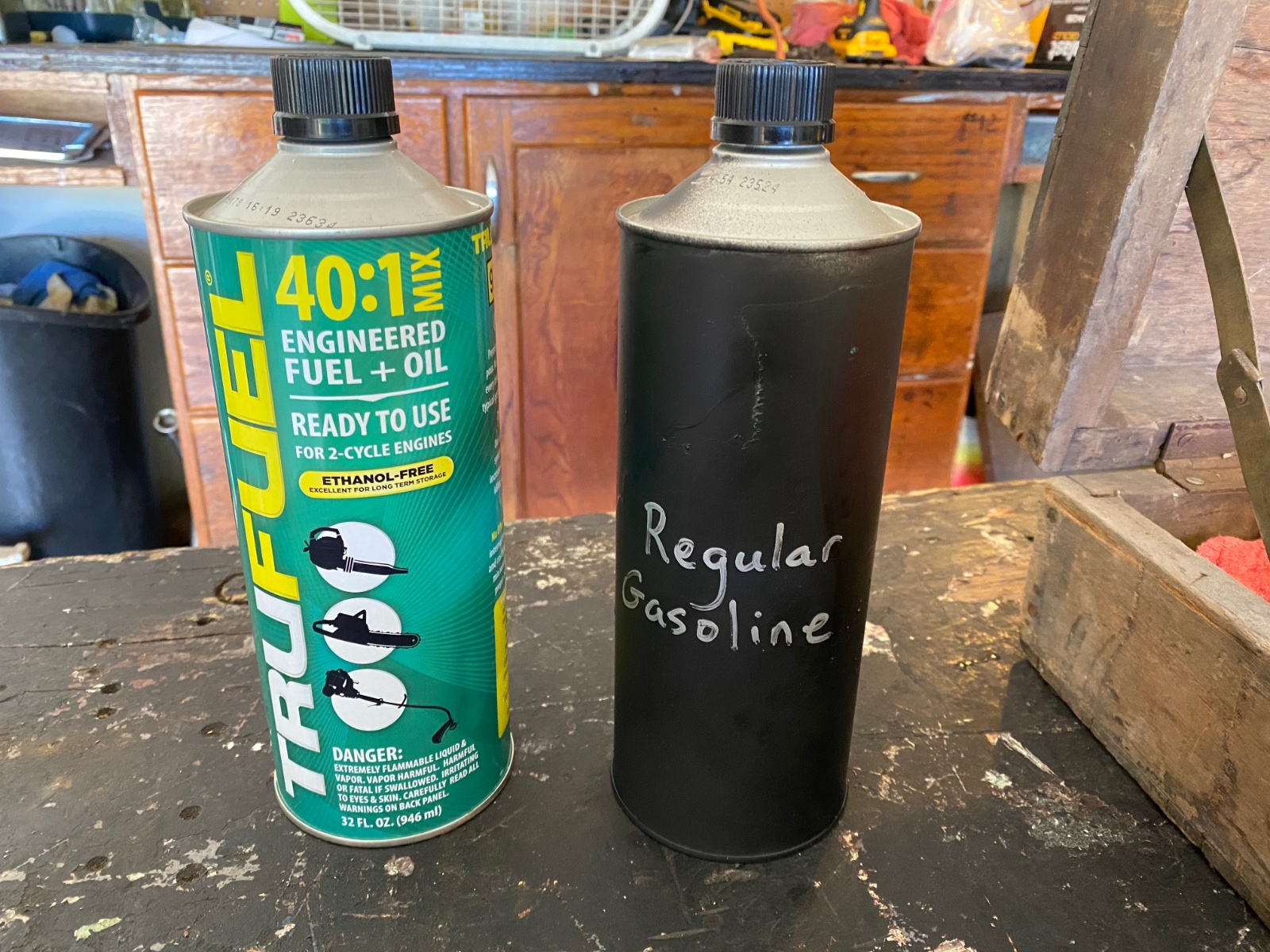 I use the pre-mix fuel for my weed-whacker and painted one of the empty cans then labeled it. It’s rated for gasoline and doesn’t leak, so it’s perfect.