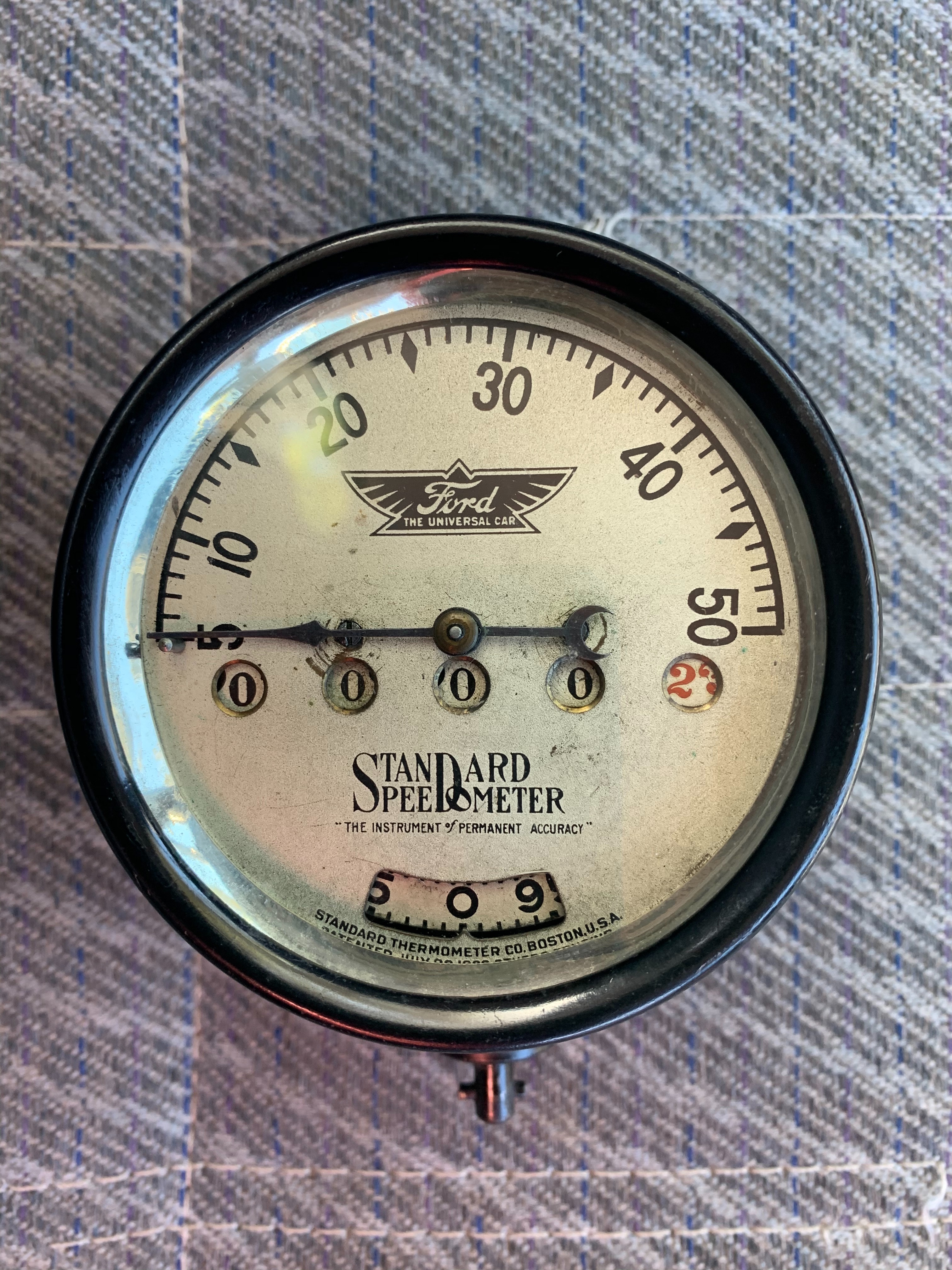 Ford offered again factory line installed speedometers from suppliers in late 1914 and thru mid 1915 or so, so yes , correct date would be 1915 or so. According to photo in Russ Furstnow's book, yours may be the late Standard Ford type, the script Ford was removed on Standard brand speedometers in 1916.