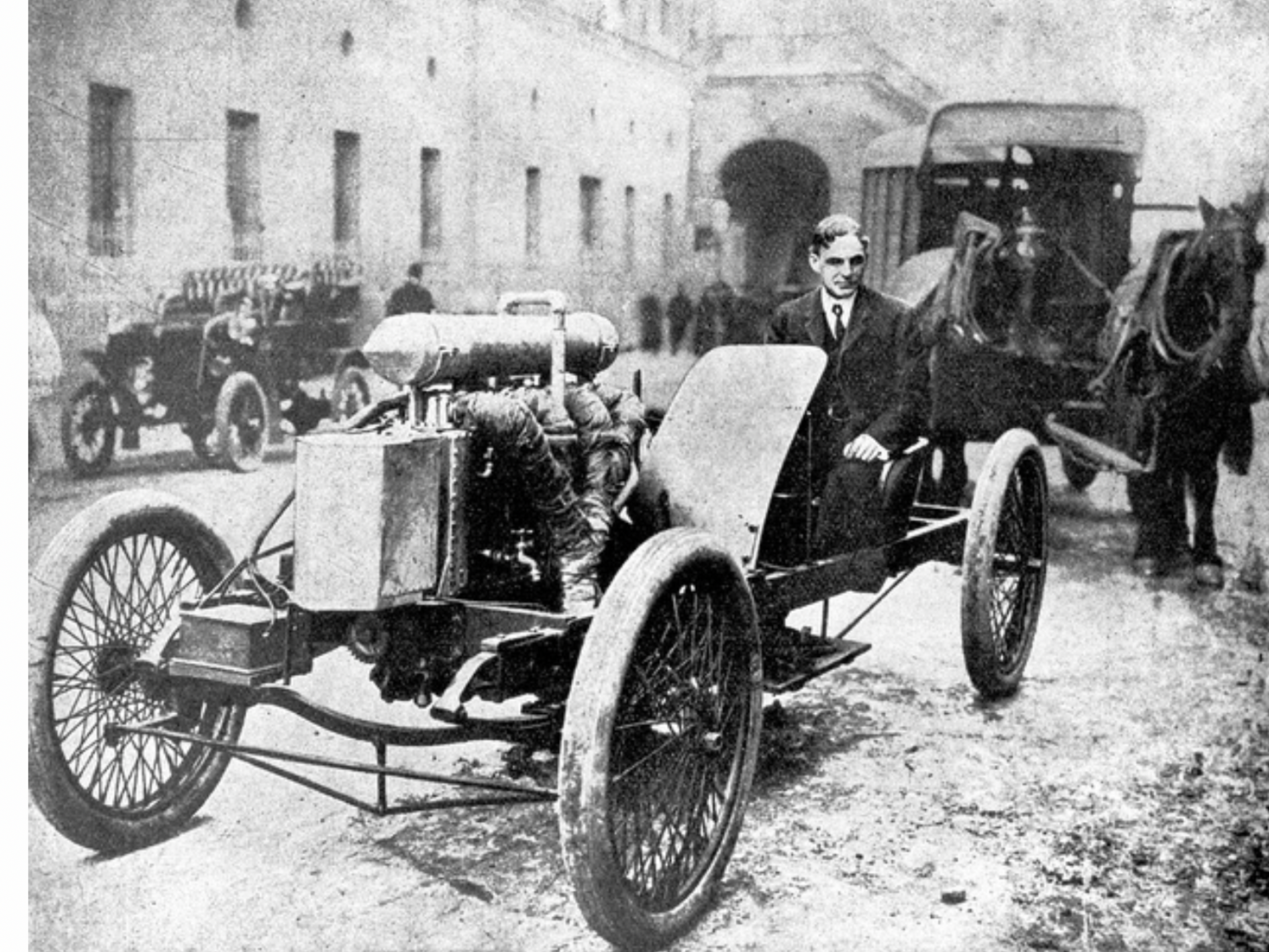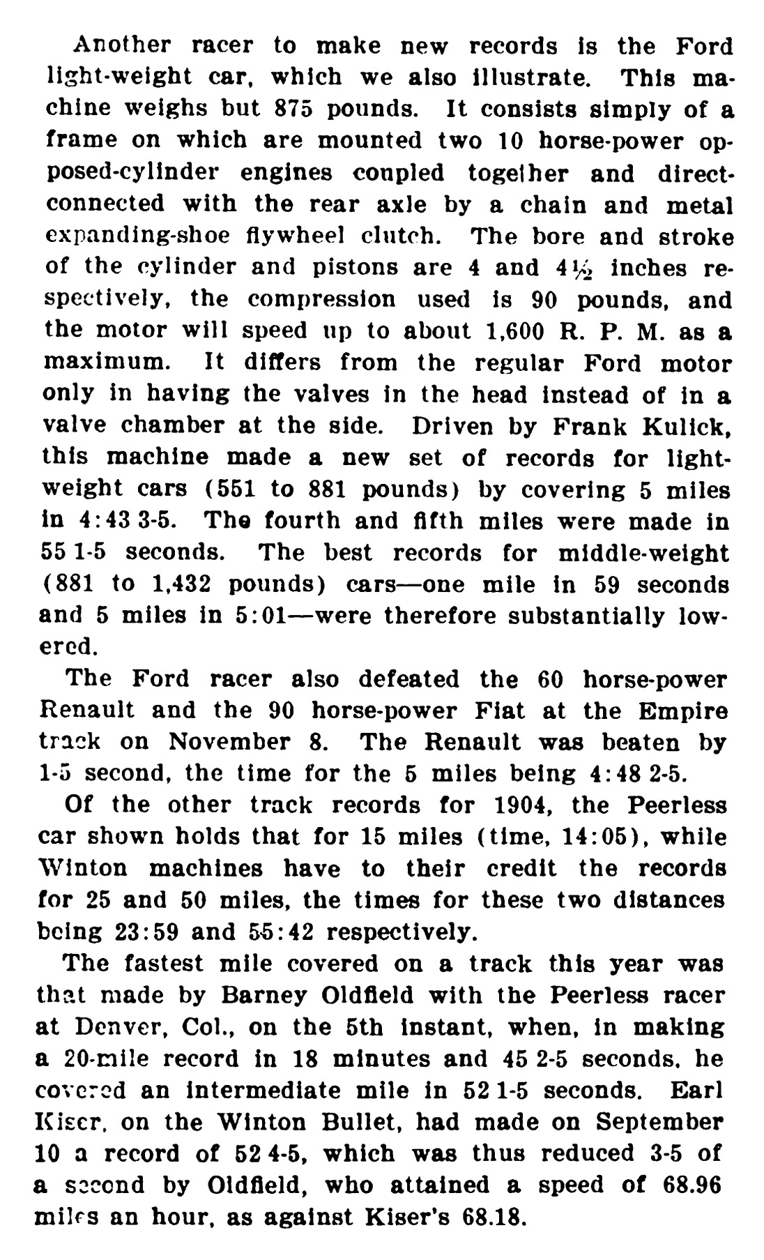This article appeared in “Scientific American” in November 1904. Kulick driving the Ford skeleton racer and Barney Oldfield with the Peerless Green Dragon: