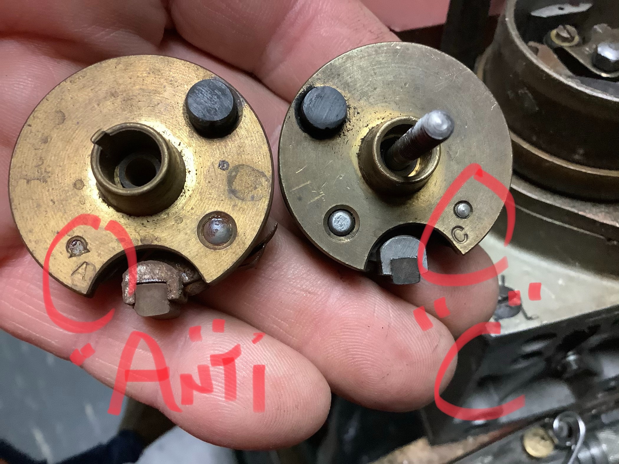 To make it easy, the cross drive front mount OR the side unit Tim Rogers posted pictures of, take clockwise points. Picture shown below, and stamped C on the backside. ( is it called a clockwise magneto ? I DUNNO) The 3 gear side drive unit takes a counter(anti)clockwise points stamped A on the backside. This for DU4 units. These units are great because they are so sturdy, bulletproof, easily changed in rotation , and timed just by moving the brass gear teeth. IGNORE THE ARROWS ON THE OILER LIDS !!