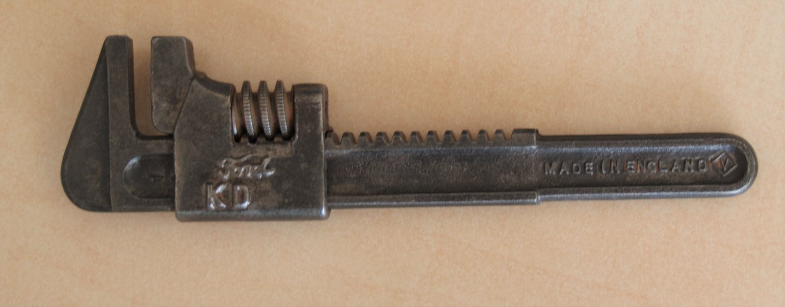 Here is an "adjustable wrench" from the tool kit of a 1950 MGTD. It is marked "made in England" but no other markings. This is what is sometimes called a "Ford Wrench" in general terms.