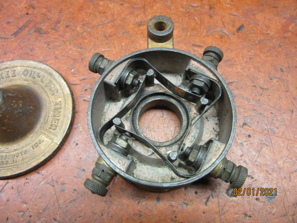 That timer, looks like the housing is made of pot metal, so it probably gets very brittle over time (which may lend itself to why they're some few (if any other than yours) around today) and didn't hold up well. I notice that the contacts have a one leaf spring on their sharp bend, is that spring soldered to the contact at the base (where it is mounted to the wire post) or merely resting on the surface held in place by the post, causing the contact to retain that bend on that rest post? Obviously this timer is held on by the clip strap like on all later than the first 2500 Model T's, so you could conceivably run in on your car today if you wanted to, but I realize because of it's scarcity you'd not want to do that, but it would work...wonder how well it did work? Then I'd wonder why nobody has bothered to reproduce this particular timer...some more fool proof than later ones.