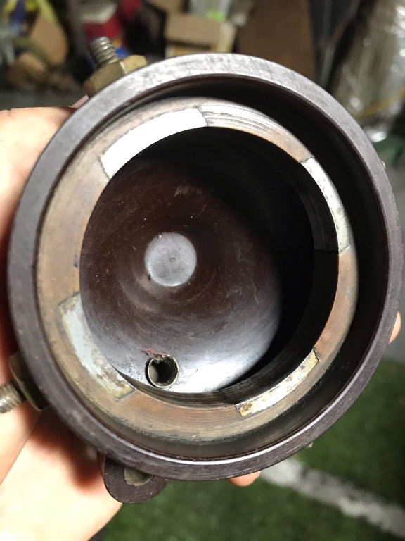 The no-kick timer looks like a zinc casting, spring steel, brass bushing, copper contact and nut configuration. Seems like the points do not align perfectly and the cam has the beginning of a crack. My other brand 1953 car has one set of points. So, I suppose this should last four times longer. Nice oil fitting or could we pack grease? I think four years ago when we first got the Model T, we made the mistake of painting after cleaning the inside of the cap, if that is what you call it. I remember that it had slime green paint on the outside and maybe some pitting on the inside.