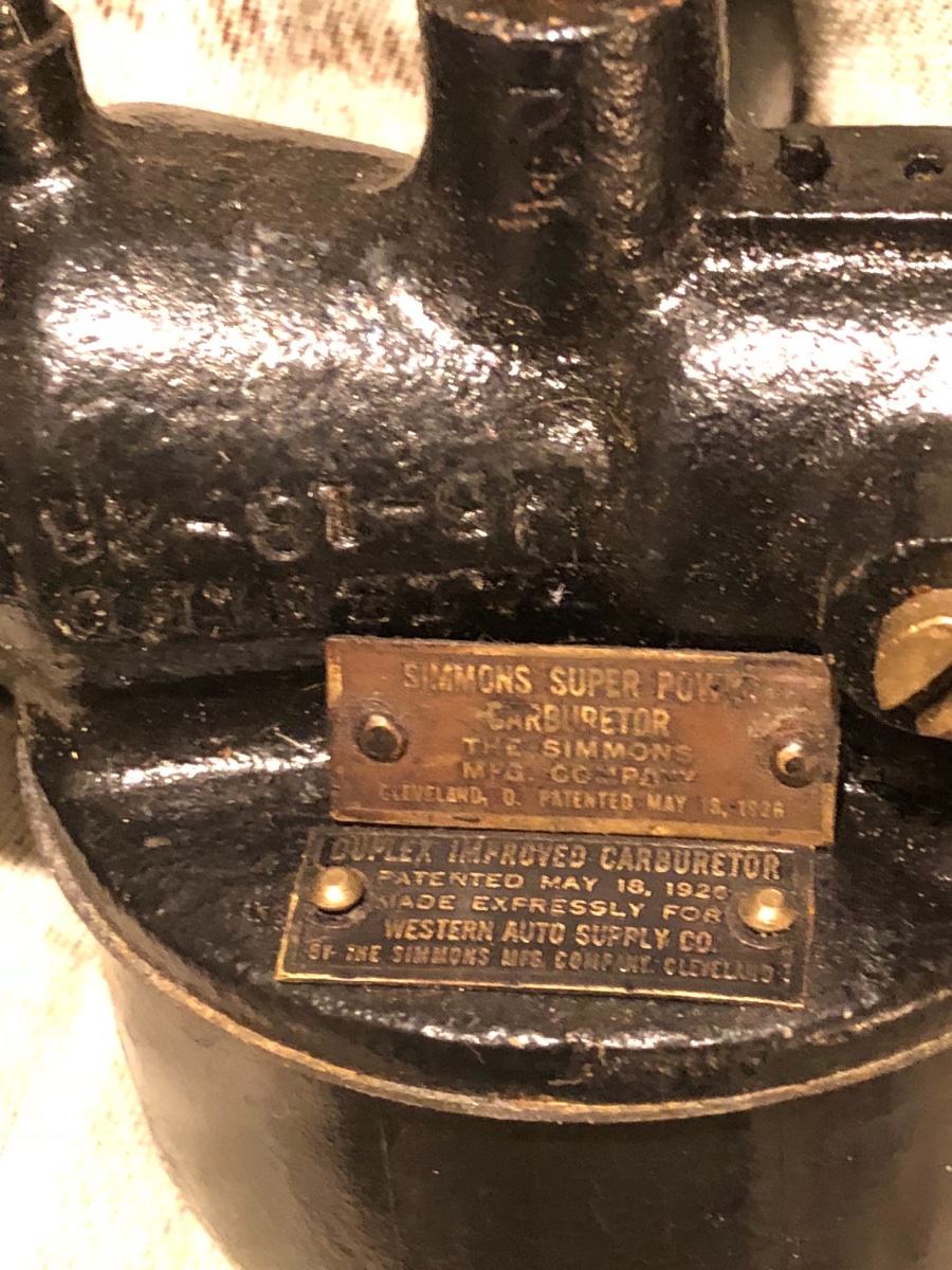 Ok, here is the Simmons Super Power Carburetor, with the heating element as an option. It seems that not all Simmons came with one...the one I've got having been sold here on the West Coast, didn't have the heating element, the place where it installs has a plug that is removeable, if you chose to buy the element option or maybe they sold the plug with the carb incase you wanted to uninstall the heating element.