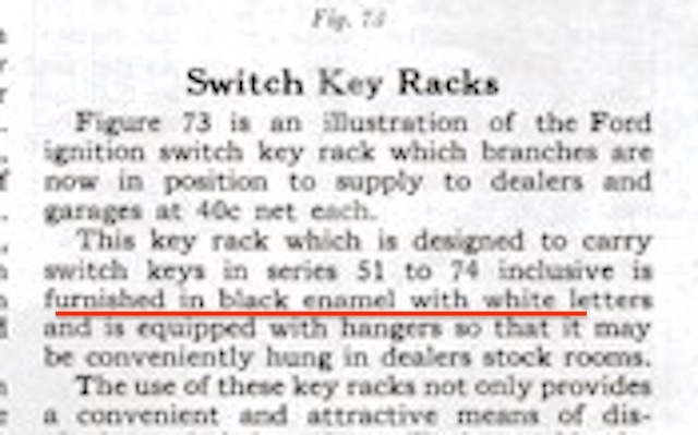 The three key boards I have are black. Here are two, one Ford script and the other is a Clum. Clum made keys for Ford and maybe made the key boards also. Gary
