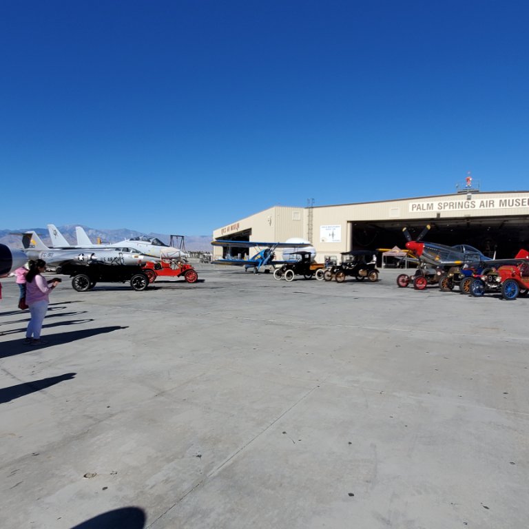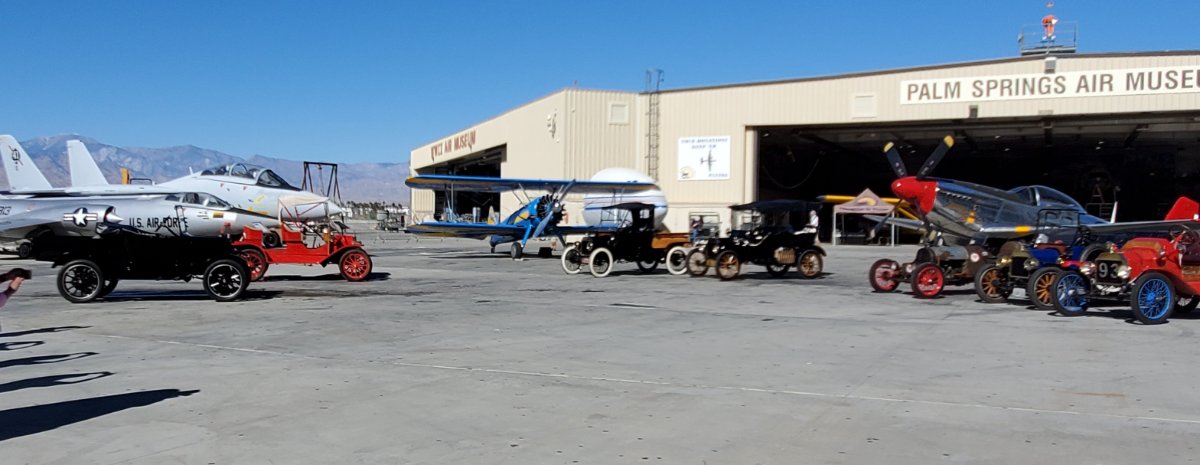 On Sunday, we were invited to the WarBirds Collection at the Palm Springs Air Museum for an exclusive VIP interactive tour led by two military pilots. Our cars were lined up around the cul de sac flanking the front entrance for all to admire. After probing every nook and cranny of their wonderful collection we were directed to bring our Ts around back and encouraged to "very carefully" position them among the historic airplanes for photographs. We couldn’t have been made to feel more welcome there. Then, after a covid-correct lunch on the lawn, we toured back to our hotel through Palm Springs’s most notable neighborhoods, including a slow pass at Liberachi’s and at Elvis’s desert retreats.