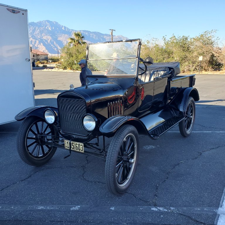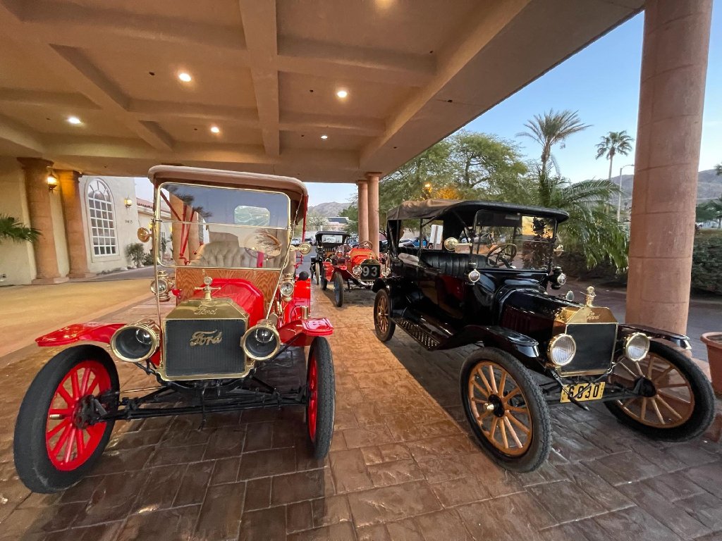 Friday, January 15th, at the Palm Springs Visitors Bureau and Miracle Springs Spa Resort’s prompting, several of our MTFCA members and their Model Ts, (independently and unsanctioned by this club or any chapter), arrived at The Miracle Springs Spa in Desert Hot Springs California. A fully stocked bar was ready poolside for our Welcome Cocktails. We mumbled through our masks at safe distances as we got to know other unrestrained Model T-ers from Utah, Arizona, and Northern California. As fellowship advanced, our sunset melted into a cool desert night and many of us drifted into one of the 6 mineral hot spring pools. Our Ts slept protected, huddled together under the grand portico just outside the resort’s lobby.