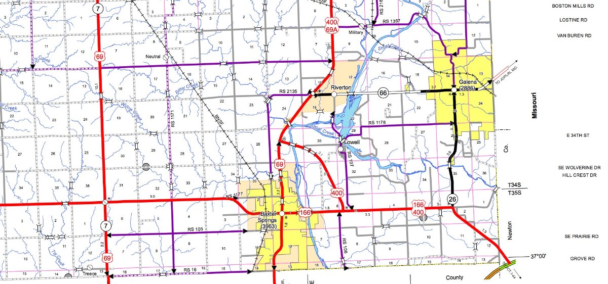 Old 66 portion of Cherokee County. The former highway is K-66, RS-2135, and US 69.