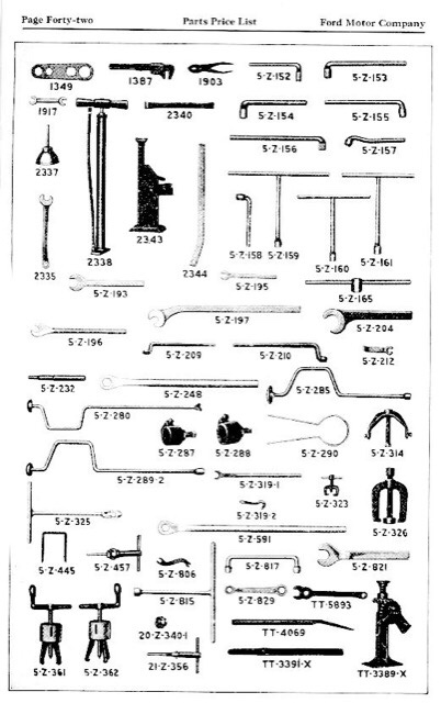 The Ford Z tools list with illustrations is copied from the Model T Encyclopedia, where it is more readable.