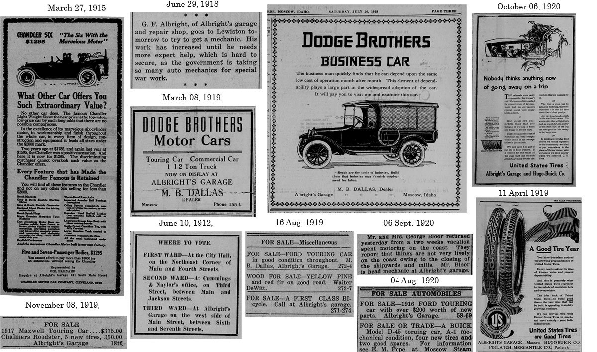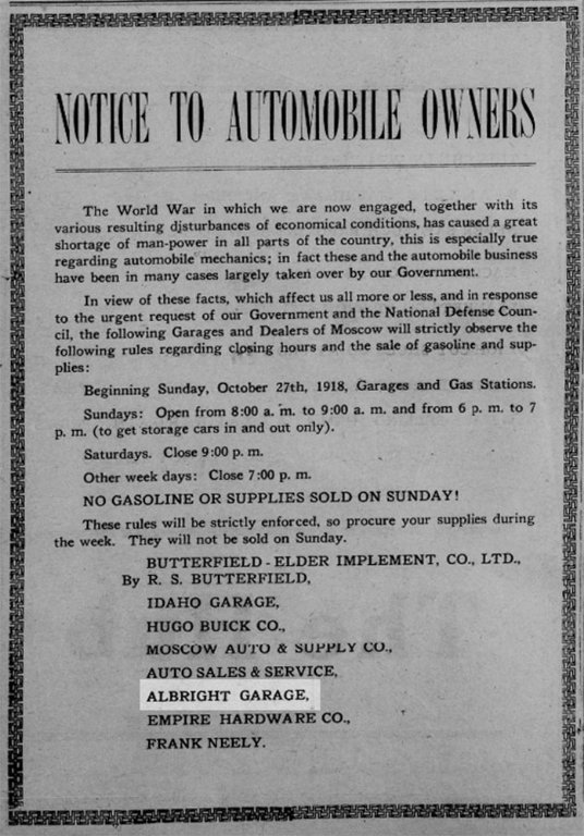 As far as WWI was concerned, I did find this notice concerning hour restrictions which mentioned Moscow and the Albright Garage.