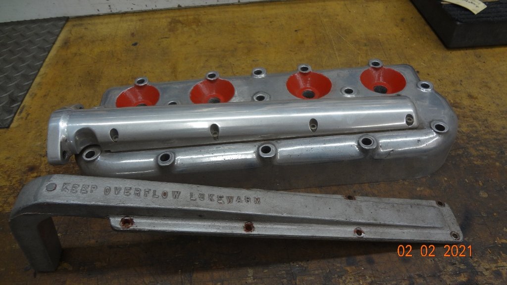 The top outlet " keep overflow warm" matches the engines in the original post. I do recall a photo of a portable "T" being carried to the lake in order to pump water to the firetruck . The "T" exhaust manifold has no threads, but it is machined to accept a pipe, I often thought this would be a possible match for the head. Gary in MN.