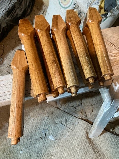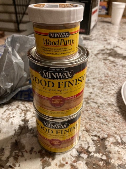 I ended up using Minwax cherry stain and matching putty because I think the originals would look very pale like in the first picture. So here they are stained with a brush then wiped with a paper towel. I am going to be using PPG Shopline (Omni) clear coat automotive 2 coats after this sanding between coats. I am going to masking tape the adjacent tape faces.