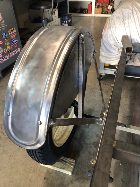 I thought I would share some old proven methods in constructing period style hugger fenders. The key in panel building is flexibility, strong joints, proper attachment, and most important...., vibration resistance. These are made from 20 gauge mild steel with only 1/8" by 1" strap steel on the cross mounting, then cold panished for strength.