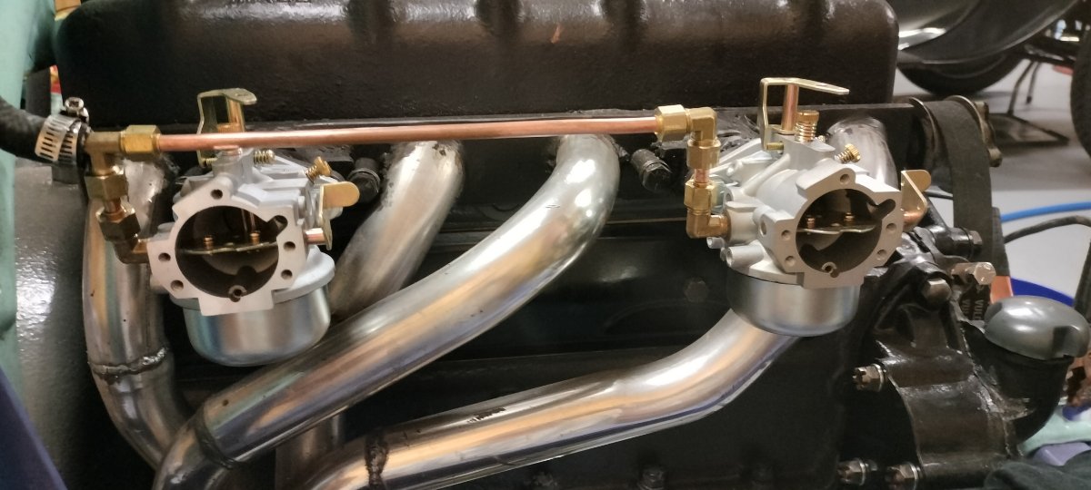 Back in the 70's when I was still welding and brazing, I took two iron manifolds; cut the curved ends of off one just after it straightened out to go to the center; brazed in a length of black iron pipe the same size as the ends and brazed everything in place so the finished product had the same measurement between ports as original; cut the carburetor flanges off both manifolds just before they started their vertical upward curve; then brazed them onto the new manifold so the two carb flanges were level and pointed straight out toward the hood sides. Mounted two rebuilt NH swayback carbs on it and hooked the throttle linkages on both together as one (not progressive). This was before I knew that there were single aftermarket carbs out there that would run as good as the crap that I had spent so much time and effort, cobbling up. All this wasted effort for nothing. Get yourself a good Stromberg OF or use a Model A Zenith intake, carb, and exhaust and save yourself some grief.
